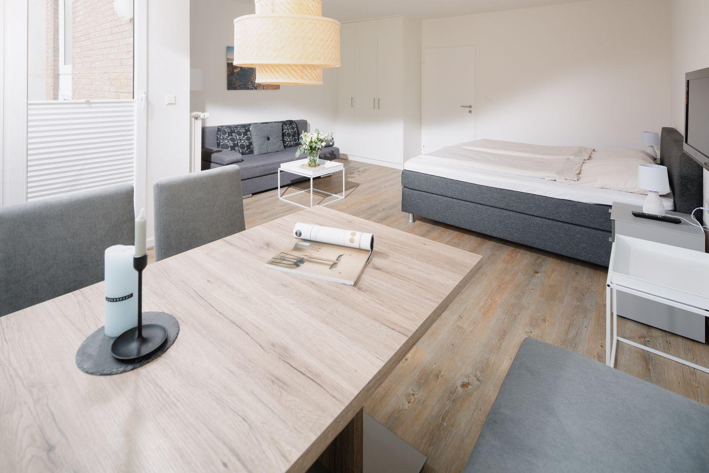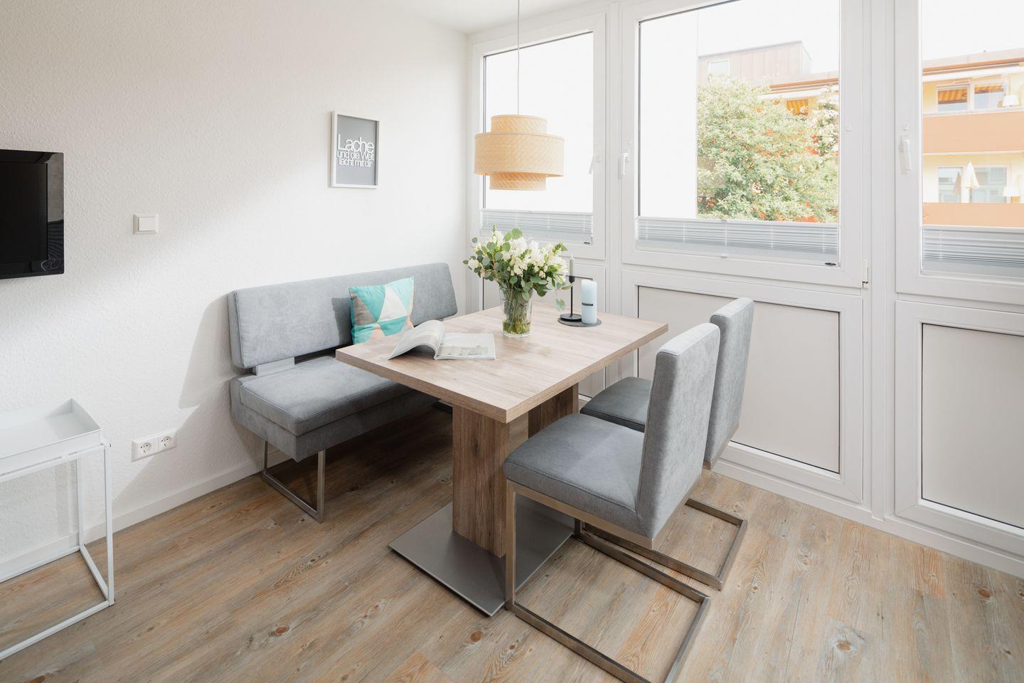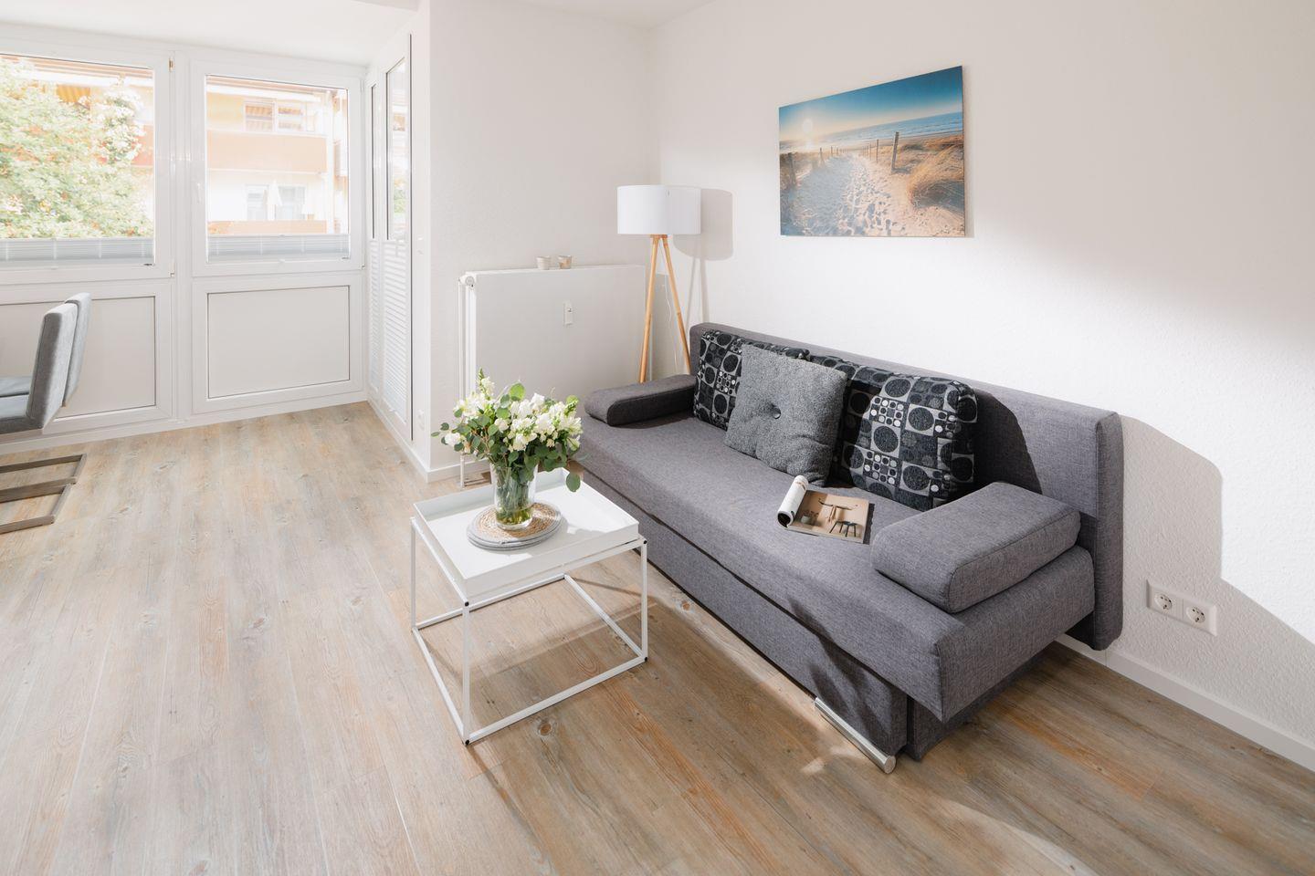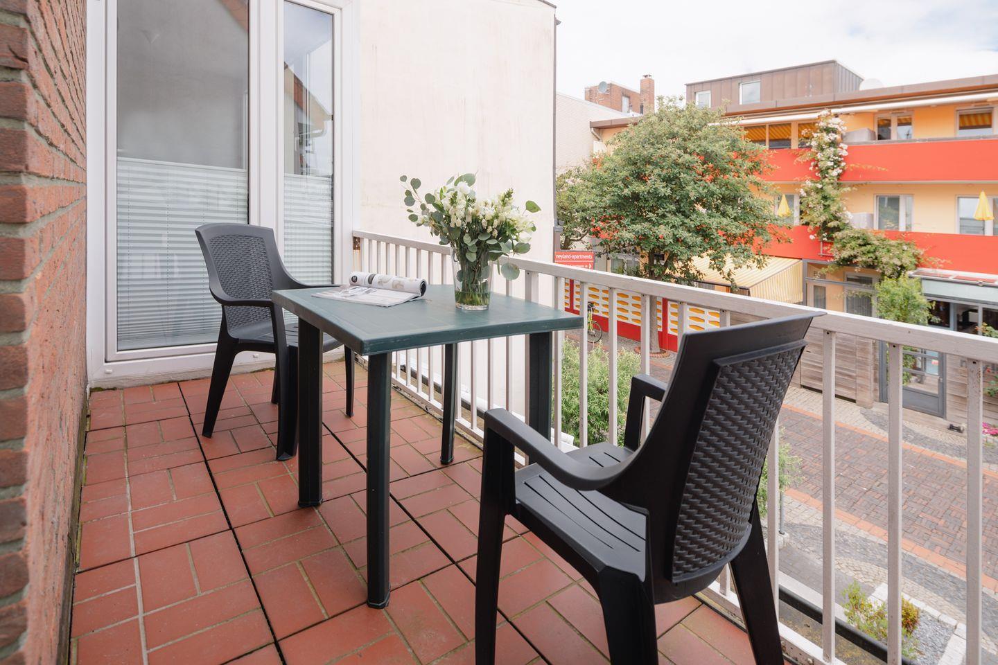 Moderne 1-Zimmer-Wohnung mit Balkon nahe Kurplatz auf Norderney, ideal für bis zu 3 Personen.