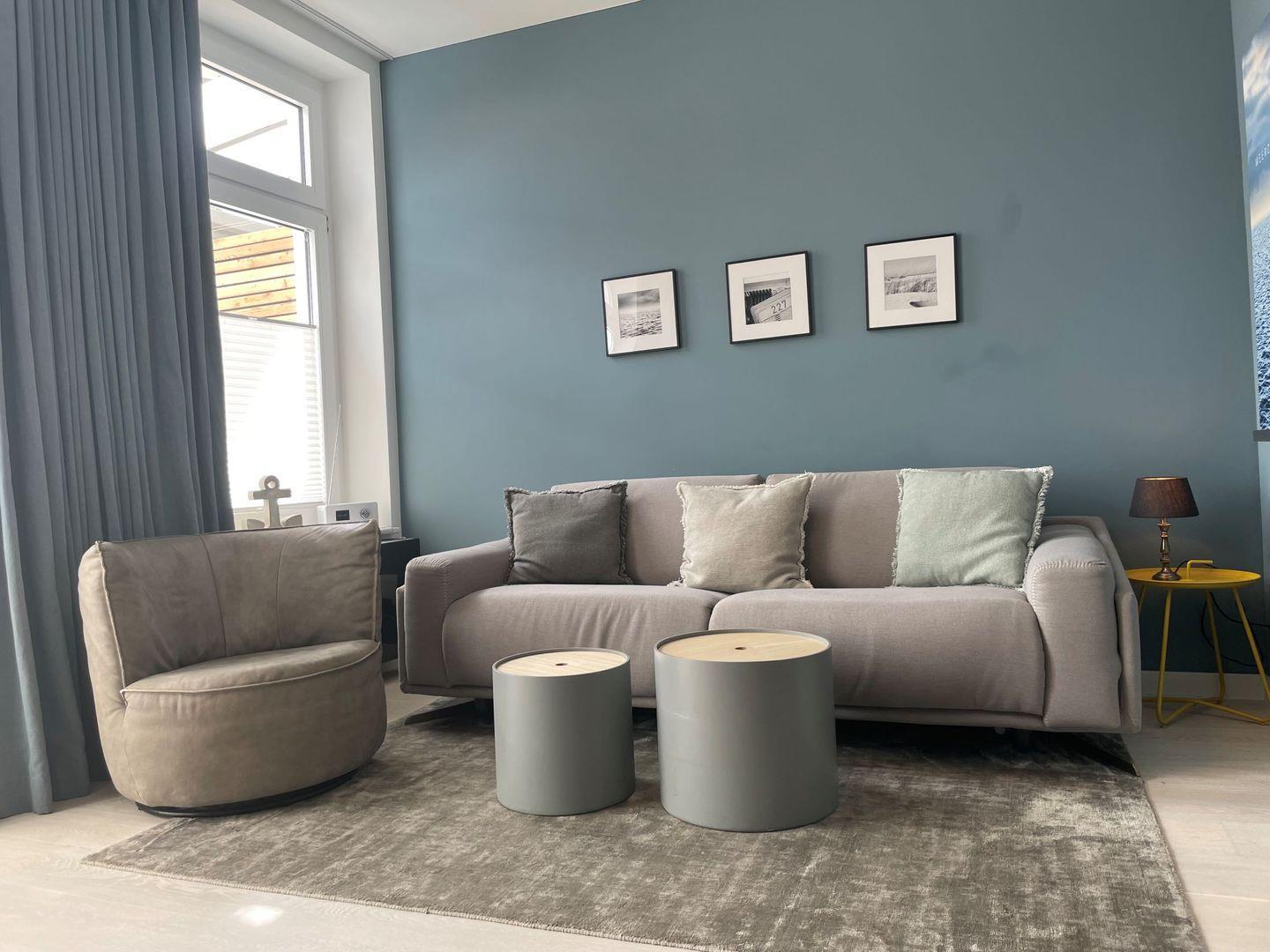 Der helle Wohnbereich ist modern und gemütlich eingerichtet. Ein bequemes Sofa lädt zum Entspannen ein und lässt sich mit wenigen Handgriffen in ein vollwertiges Schlafbett verwandeln – perfekt für eine dritte Person. Ein Flachbild-TV sorgt für entspannte Abende.