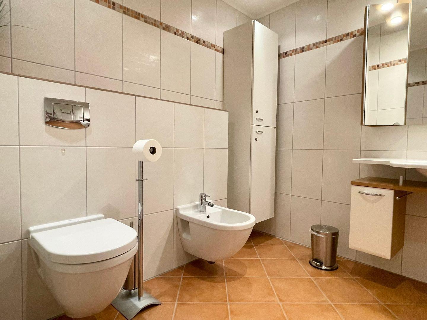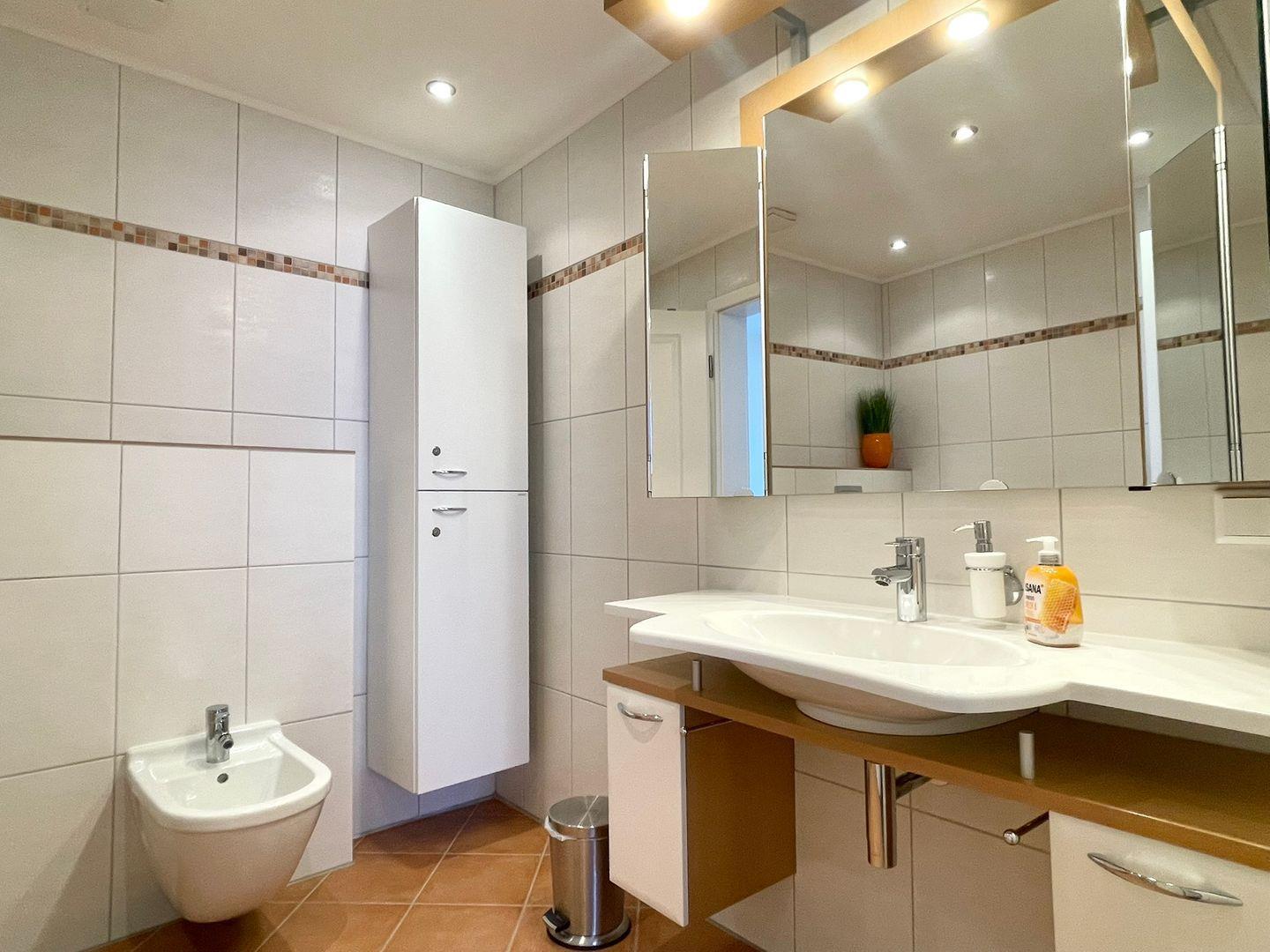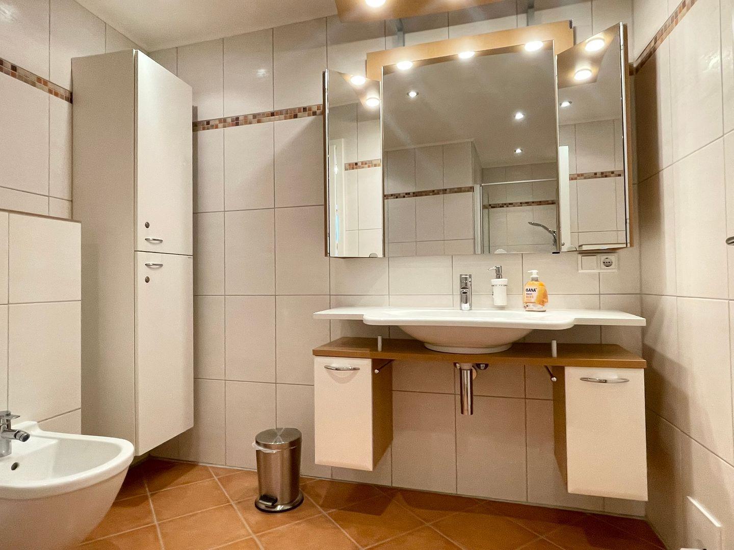 Das geräumige Badezimmer ist modern eingerichtet und bietet Dusche, WC, Bidet, Handtuchheizkörper, Fußbodenheizung und Fön. Zusätzlich steht Ihnen ein separates Gäste-WC zur Verfügung.