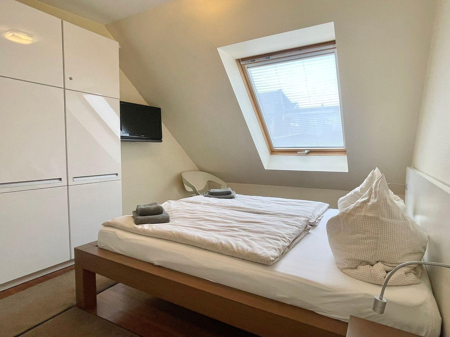 Ein weiteres kleines Schlafzimmer ist mit einem größeren Einzelbett, ebenfalls einem Flachbild-TV sowie einem Möbelsafe ausgestattet. Beide Schlafräume können durch Innenrollos bequem verdunkelt werden.