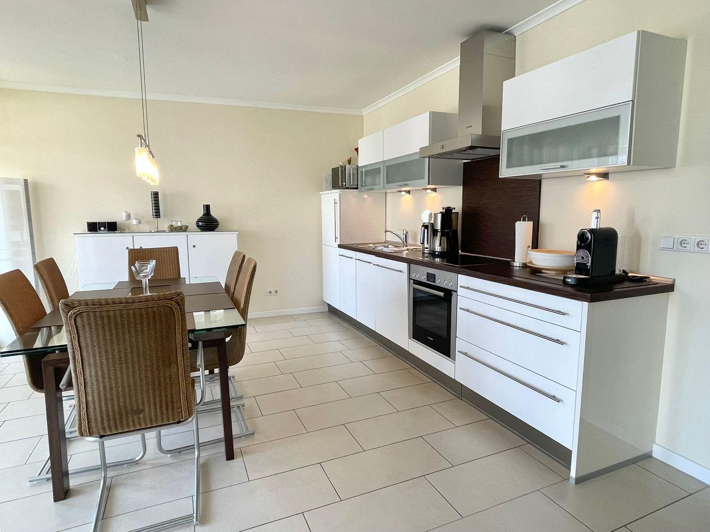Die offene Küche ist vollständig eingerichtet und verfügt über Geschirrspüler, Mikrowelle, Backofen, Cerankochfeld, Kühlschrank mit Gefrierfach und Dunstabzugshaube. Zur Grundausstattung gehören Kaffeemaschine, Wasserkocher, Toaster, Geschirr, Gläser, Besteck, Kochutensilien sowie ein Staubsauger.