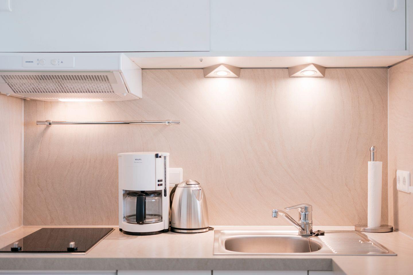 Der Wohn- und Schlafbereich ist offen gestaltet und mit einem bequemen Doppelbett, einem Essplatz sowie einer gut ausgestatteten Kochnische eingerichtet – ideal für kleine Mahlzeiten zwischendurch oder ein gemütliches Frühstück. Das moderne Badezimmer verfügt über Dusche, Waschtisch und WC.