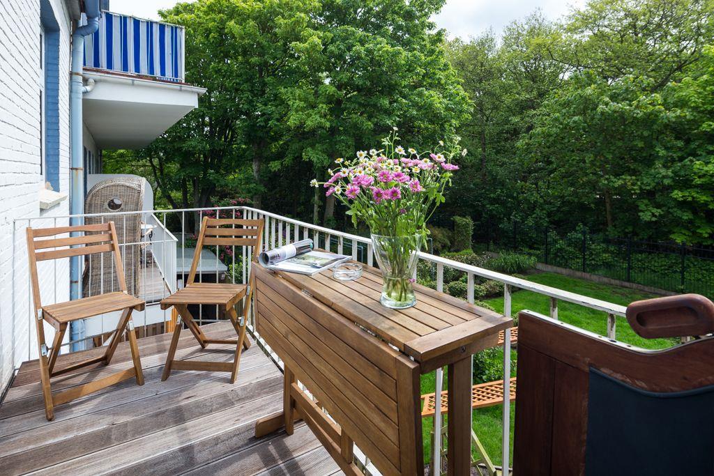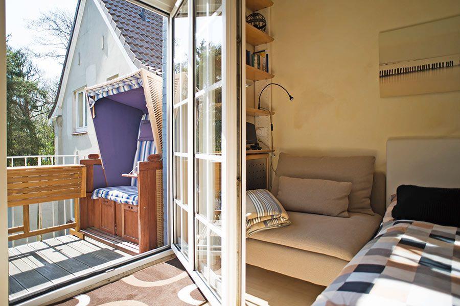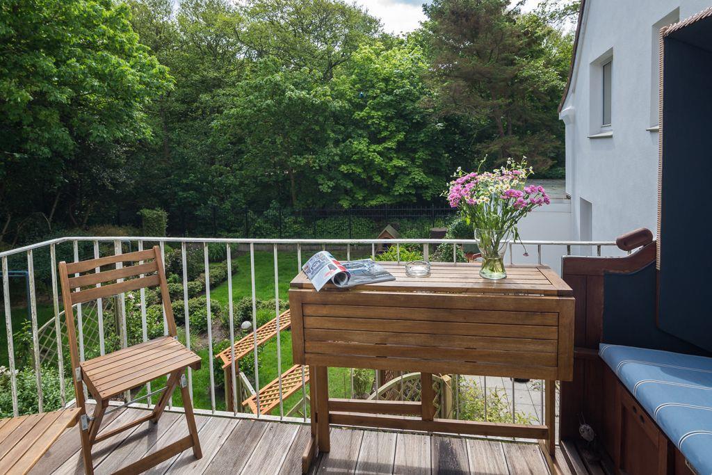 Genießen Sie die Zeit im Freien auf Ihrem privaten, nach Süden ausgerichteten Balkon, ausgestattet mit einem Tisch, 2 Stühlen und einem Strandkorb.