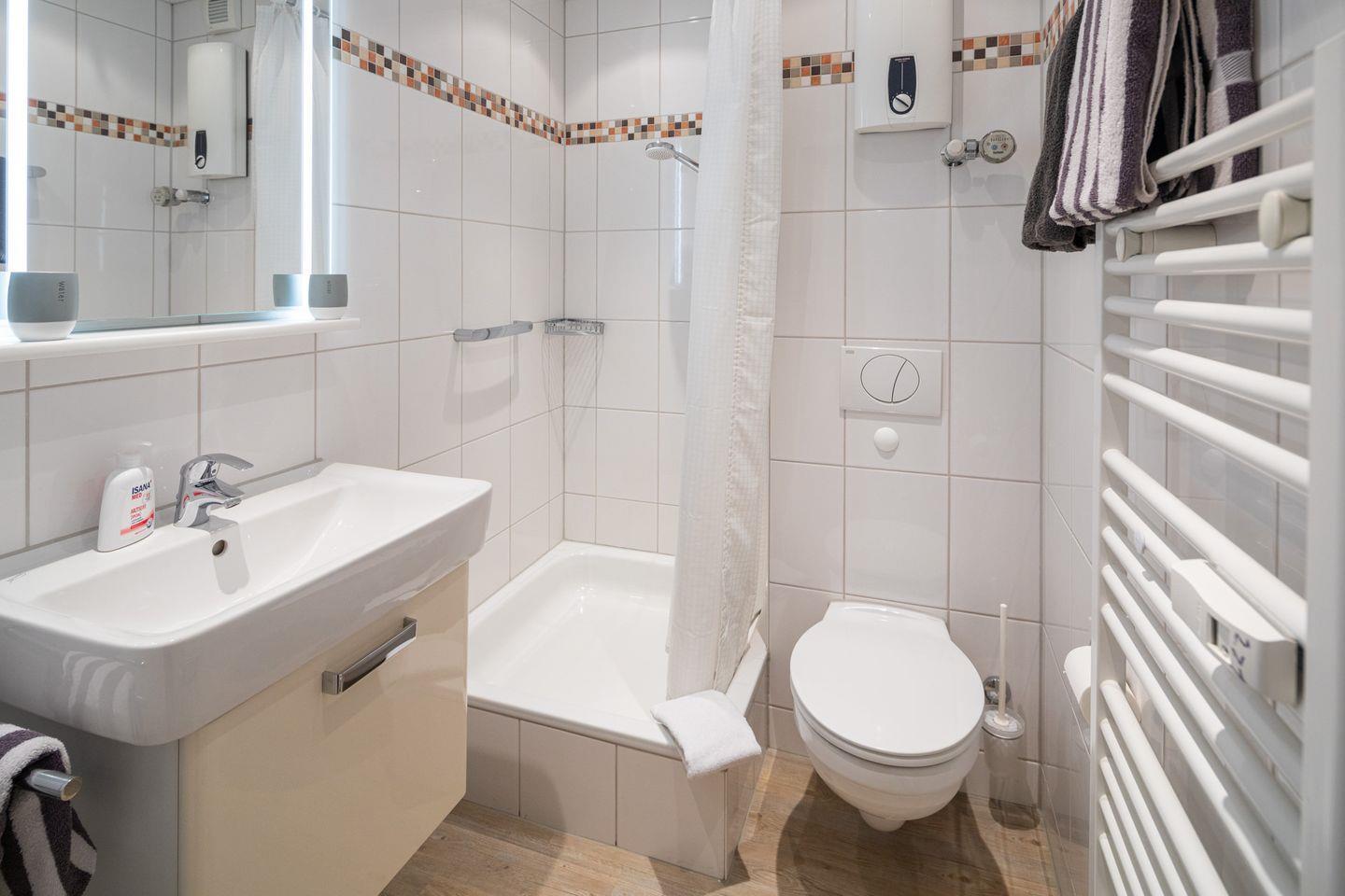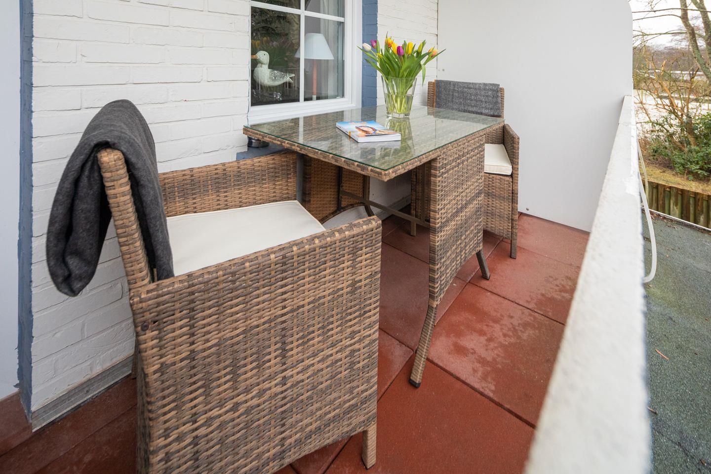 Ein besonderes Highlight des Appartements ist der private Balkon, auf dem Sie bei einem Morgenkaffee die frische Nordseeluft genießen oder den Tag bei einem Glas Wein ausklingen lassen können. Zudem finden Sie im Wohnbereich ein bequemes Sofa, einen Essbereich und einen Flachbildfernseher, ideal, um sich nach einem ereignisreichen Tag zu entspannen.