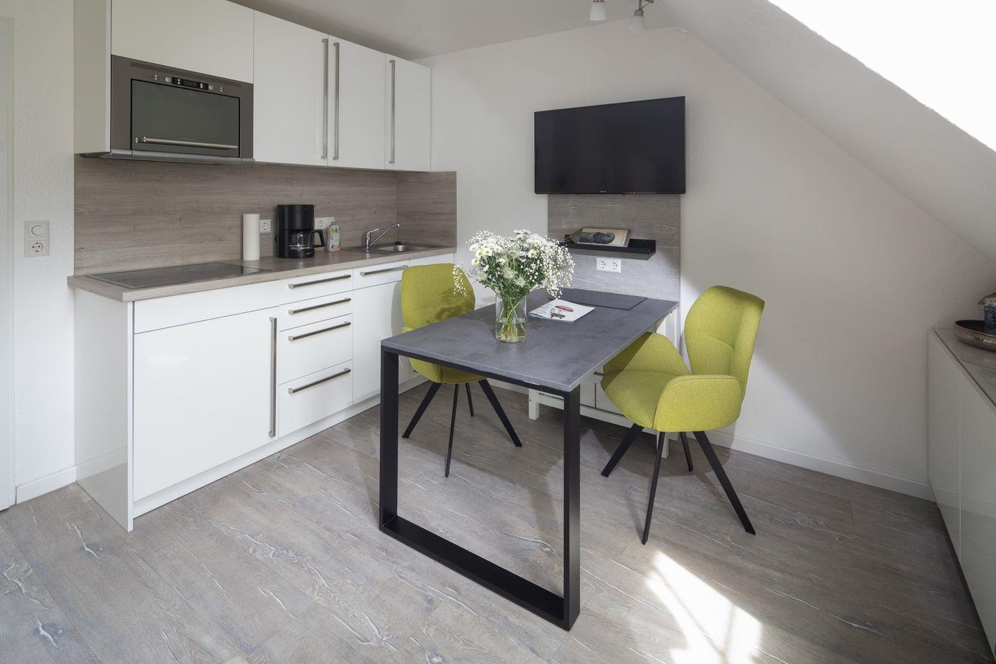 Die offene Küche bildet einen einladenden Mittelpunkt der Wohnung. Ausgestattet mit hochwertigen Geräten, darunter ein Cerankochfeld, eine Spülmaschine, eine Mikrowelle, ein Kühlschrank und eine Kaffeemaschine, können Sie hier einfach zauberhafte Mahlzeiten zubereiten. Der Essbereich lädt zu geselligen Abendessen ein, während das gemütliche Wohnzimmer mit TV und Sofa einen perfekten Ort zum Entspannen nach einem erlebnisreichen Tag bietet.