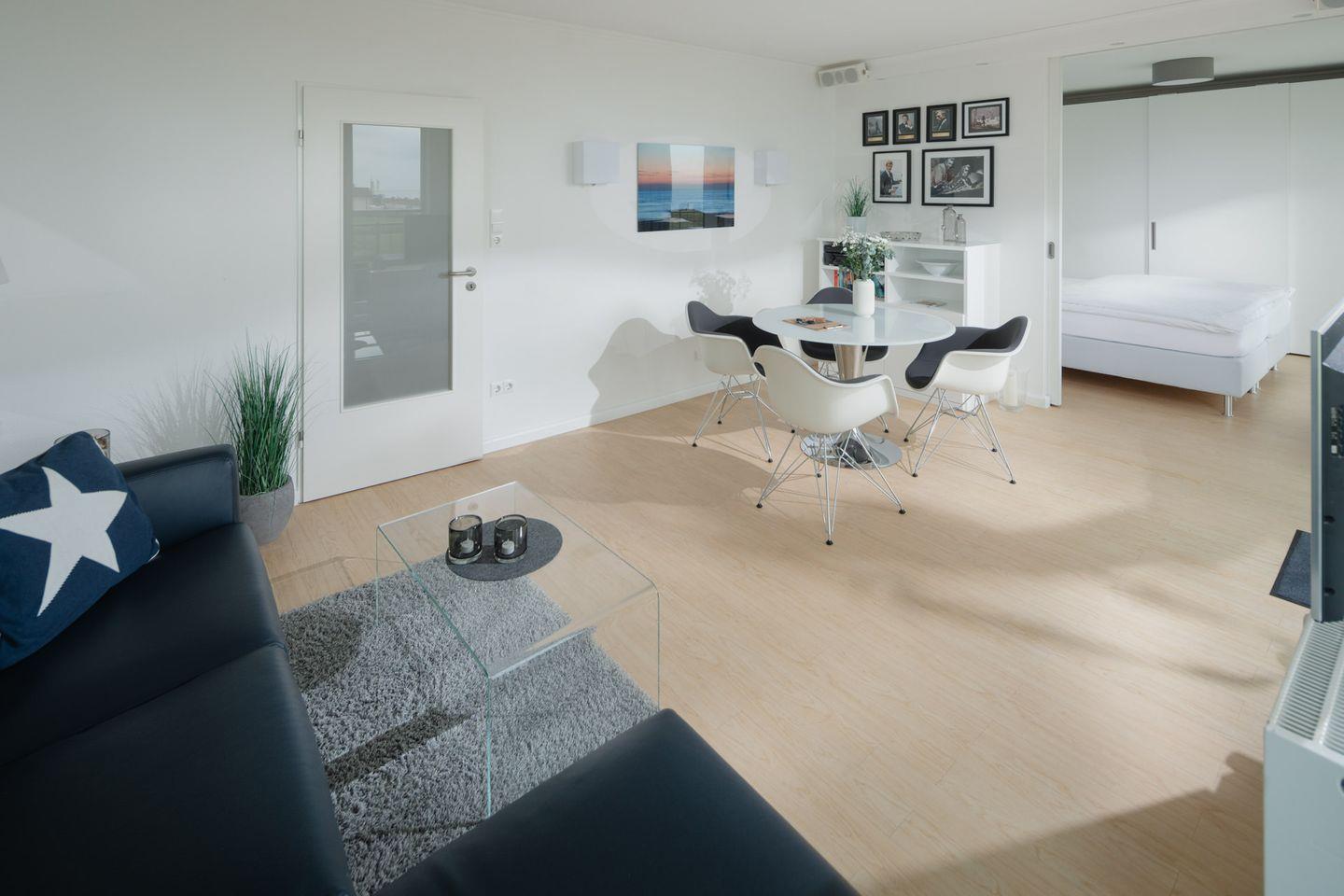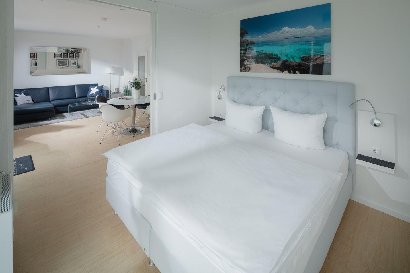 Die Wohnung ist geschmackvoll eingerichtet und verfügt über ein komfortables Boxspringbett der Größe 180x200cm im abtrennbaren Schlafzimmer. Hier können Sie sich nach einem ereignisreichen Tag entspannen und die beruhigenden Geräusche des Meeres im Hintergrund genießen. Ein SmartTV und WLAN stehen zur Verfügung, falls Sie sich unterhalten oder mit der Welt in Verbindung bleiben möchten.