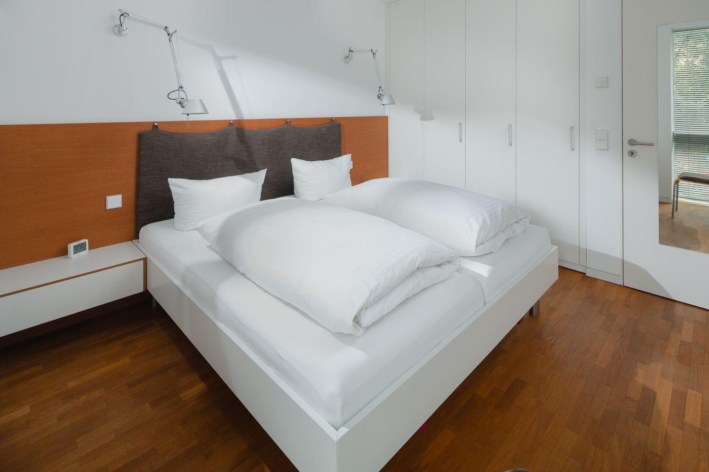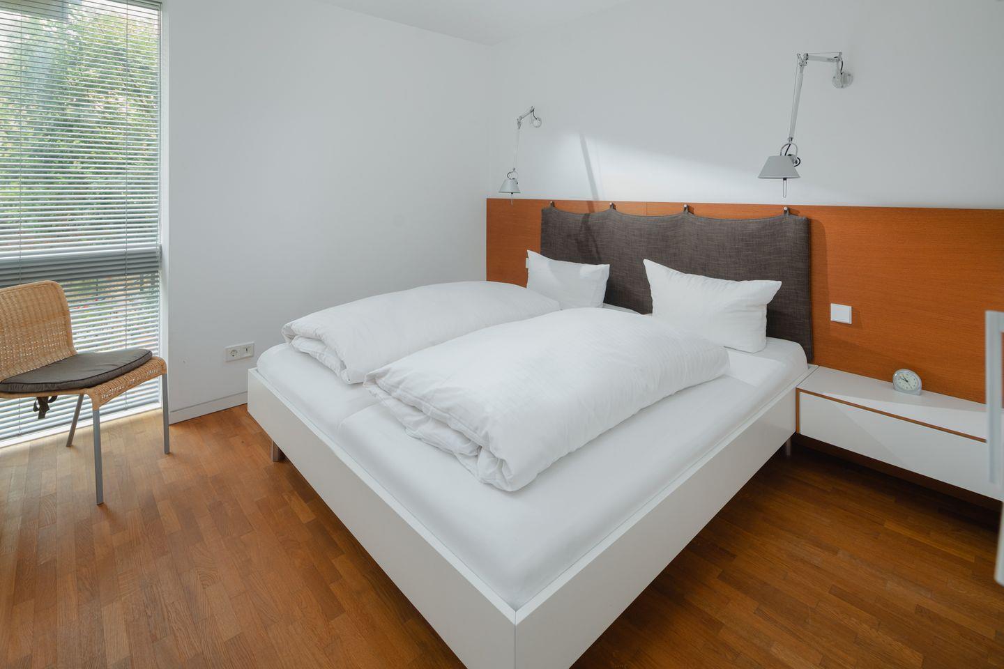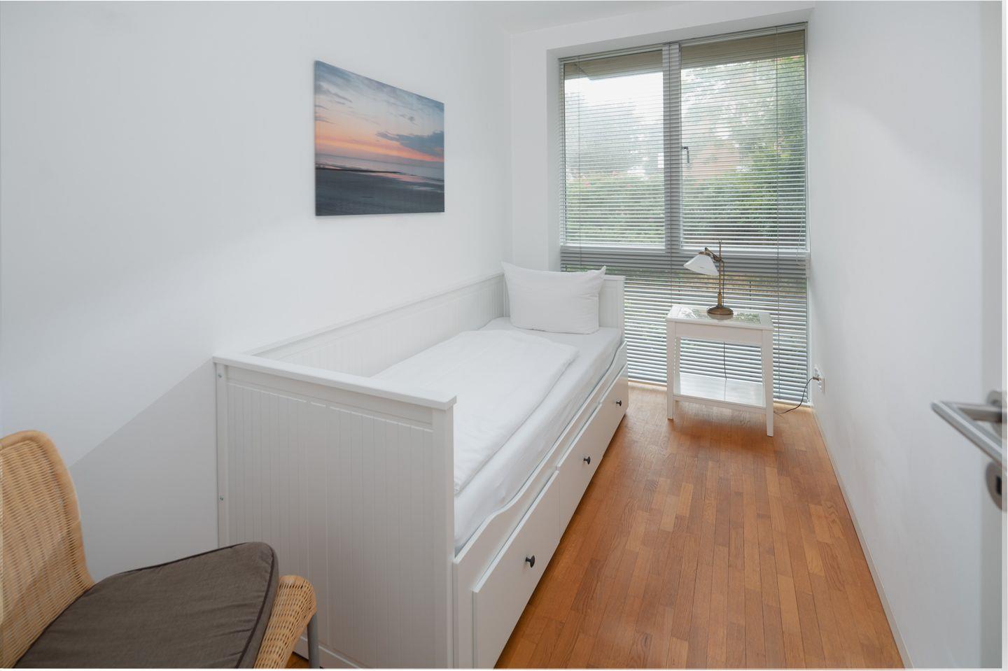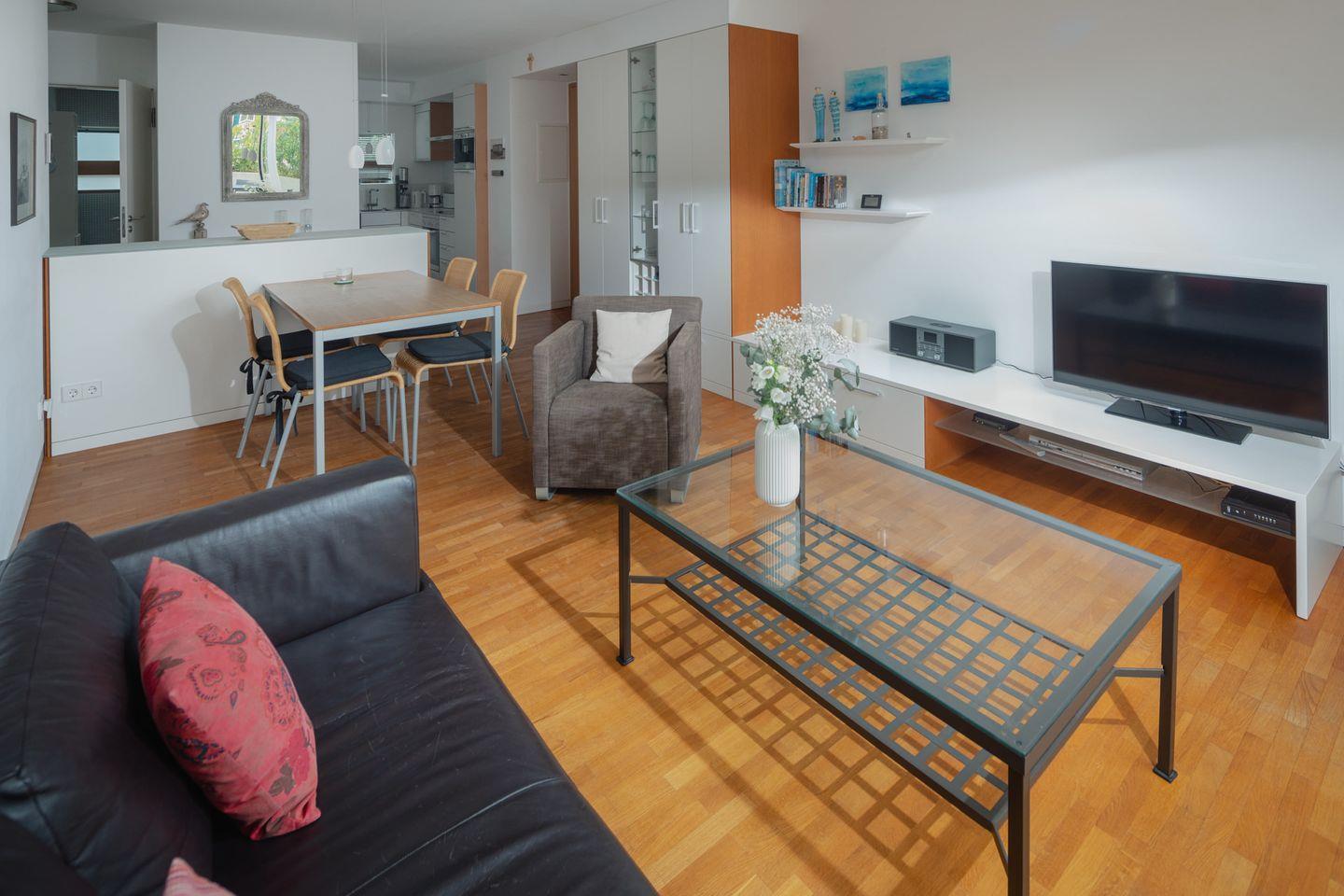 Die Ferienwohnung selbst verfügt über eine Terrasse zur Südseite, die es den Gästen ermöglicht, die Sonne und frische Luft zu genießen. Die Wohnung bietet Platz für verschiedene Ansprüche: Es gibt ein Schlafzimmer mit einem Doppelbett, das für Paare oder Personen, die zusätzlichen Platz wünschen, geeignet ist. Außerdem gibt es ein weiteres Schlafzimmer mit einem Einzelbett, was sich gut für Alleinreisende oder Kinder eignet. Das Wohnzimmer ist kombiniert mit einer Küche mit Kaffeevollautomat, was eine angenehme Atmosphäre schafft und den Gästen ermöglicht, gemeinsame Mahlzeiten zuzubereiten und zu genießen.