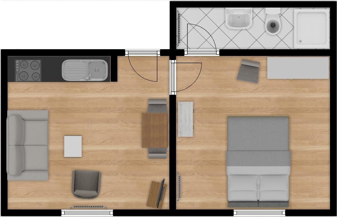 2-Raum-Wohnung Nora 2 befindet sich im Dachgeschoss des Hauses in der 2. Etage. Die Wohnung verfügt über 1 Schlafzimmer mit 180x200cm Doppelbett und 1 Wohnzimmer mit Küchenzeile. Im Wohnraum befinden sich ein 2-Sitzer-Sofa mit Schlaffunktion, 1 Cocktailsessel sowie 1 Esstisch. Vom Schlafzimmer gelangen Sie ins Bad mit Dusche/WC. Alle Fenster verfügen über Verdunkelungsmöglichkeit. Kein Clubtourismus oder Gruppenreisen.