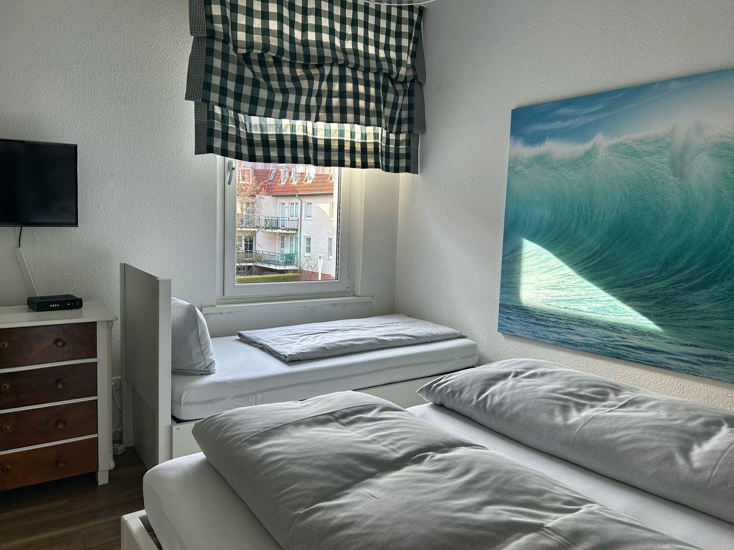 Komfortable 3-Raum-Ferienwohnung in ruhiger, zentraler Lage. Die Wohnung verfügt über zwei Schlafzimmer mit Doppelbetten (TV), Wohnraum mit Sitzbereich, Küchenzeile (Backofen, Spülmaschine) sowie Zugang zum großzügigen Ostbalkon. Über den langen Flur erreichen Sie das Badezimmer mit Dusche/ WC sowie Gäste-WC. Das 2. Schlafzimmer verfügt ebenfalls über einen schönen Westbalkon. NICHTRAUCHERWOHNUNG.