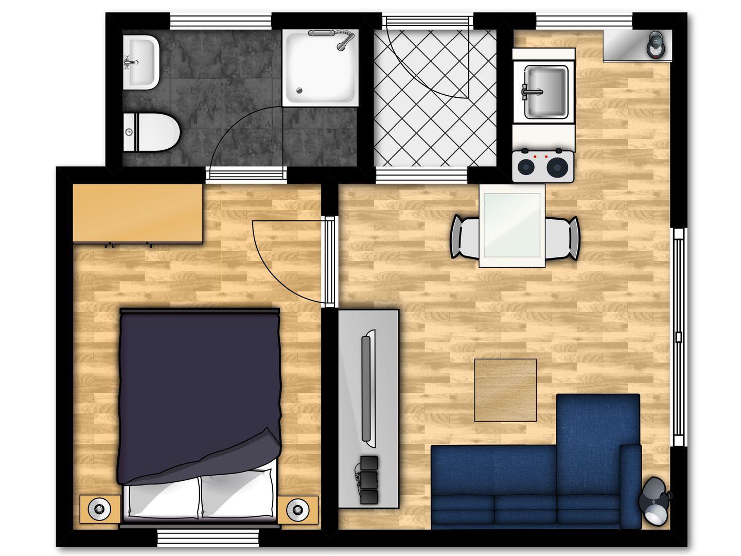 Die Wohnung verfügt über ein bequemes Schlafzimmer mit Platz für zwei Personen. Hier können Sie sich nach einem erlebnisreichen Tag in der Natur entspannt zurückziehen. Das Badezimmer ist großzügig geschnitten und mit einer Dusche ausgestattet – ideal, um nach einem Tag am Strand schnell frisch zu werden. Eine zusätzliche Kochnische erlaubt es Ihnen, selbst Ihre Lieblingsgerichte zuzubereiten. Ausgestattet mit allen notwendigen Küchenutensilien, einem Kühlschrank, Toaster, Wasserkocher und einer Kaffeemaschine, wird das Kochen zum Kinderspiel.