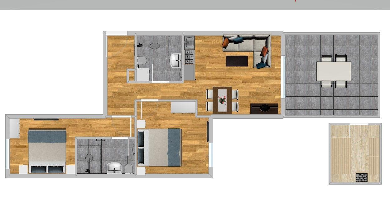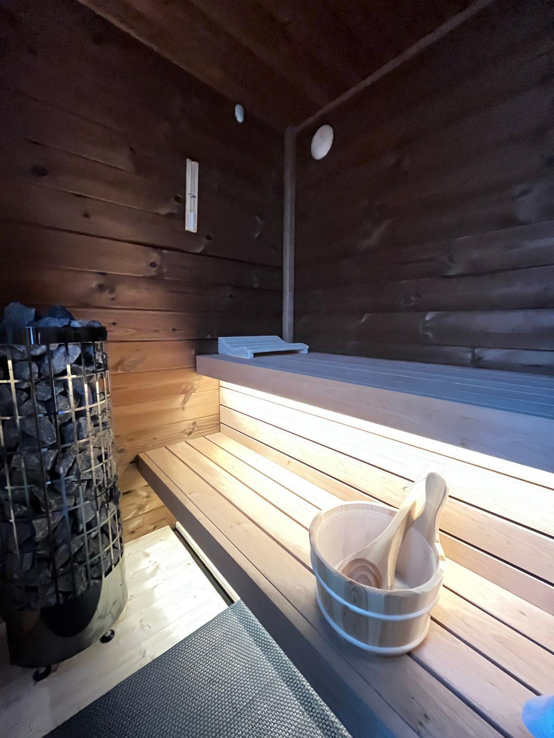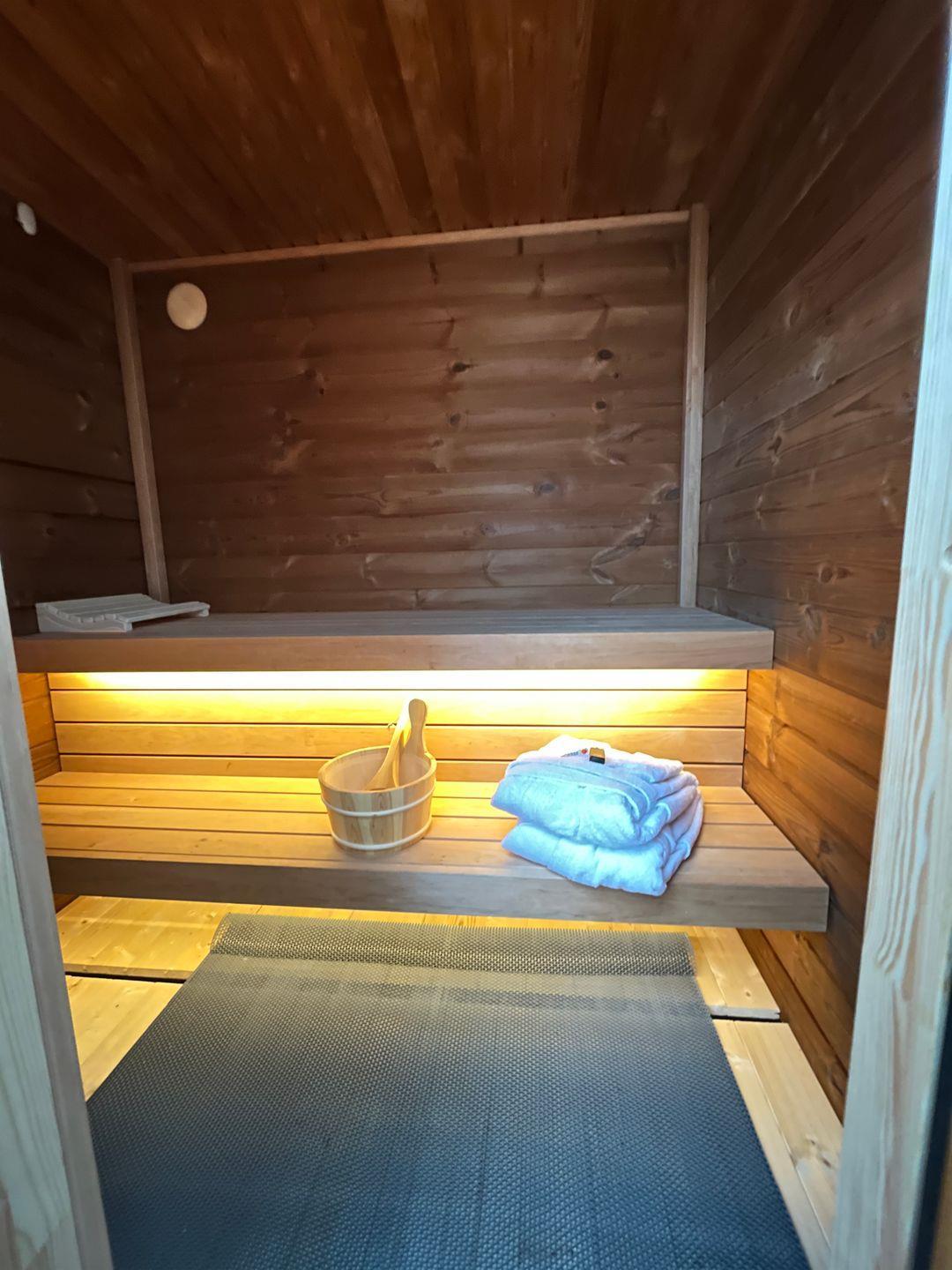 Die Sonne hat euch noch nicht genug eingeheizt? Dann bringt euch die kleine Aussensauna für 2-4 Personen auf Temperatur. Die Terrasse lädt zum gemütlichen Beisammensein ein.