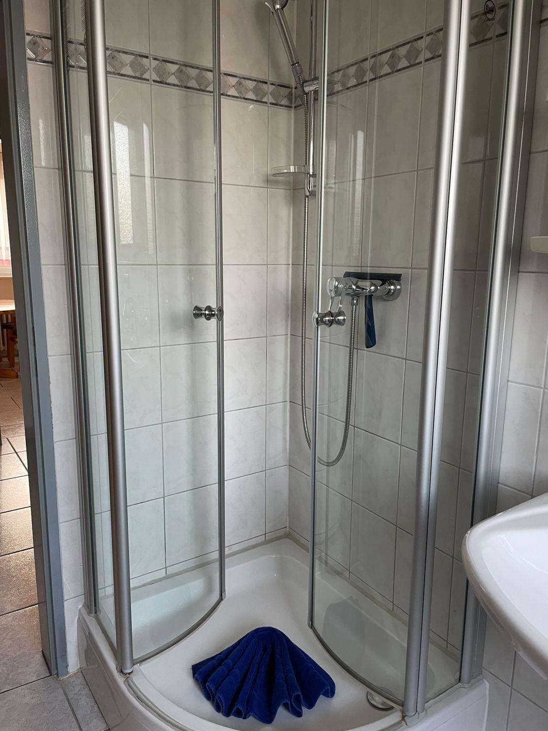 mit Essecke, Kühlschrank, Gefrierfach und ein Badezimmer mit Dusche/WC sowie