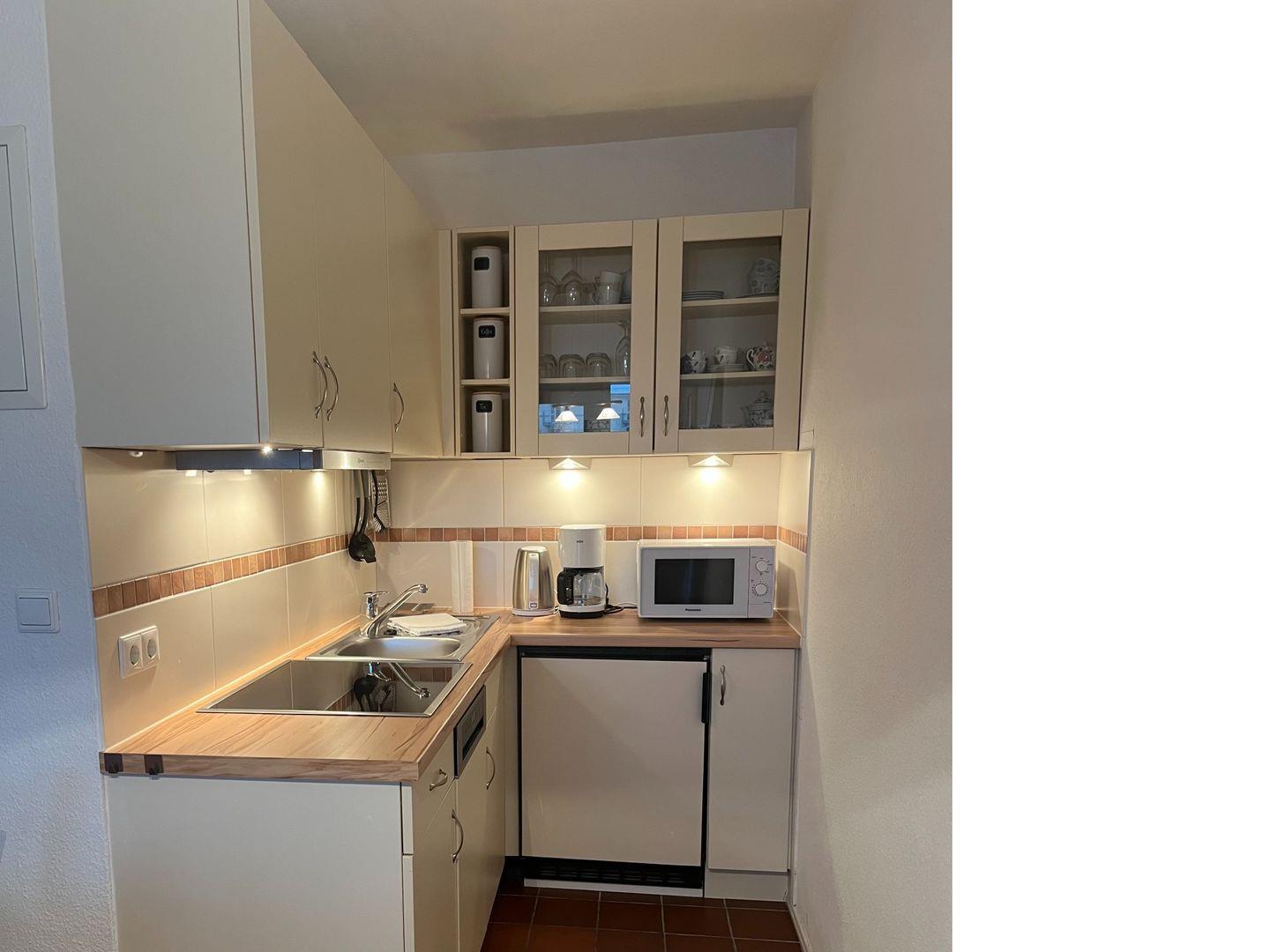 Die ca. 40 m² große Wohnung im 3. Obergeschoss, verfügt über einen separaten Schlafraum mit einen Doppelbett ( 1,80 x 2,00 m) und einen Wohnraum mit Sofa und Sessel. Die Küchenzeile sowie der Essplatz sind im Wohnraum integriert. Ein Etagenbett für Kinder ist im Flur integriert.