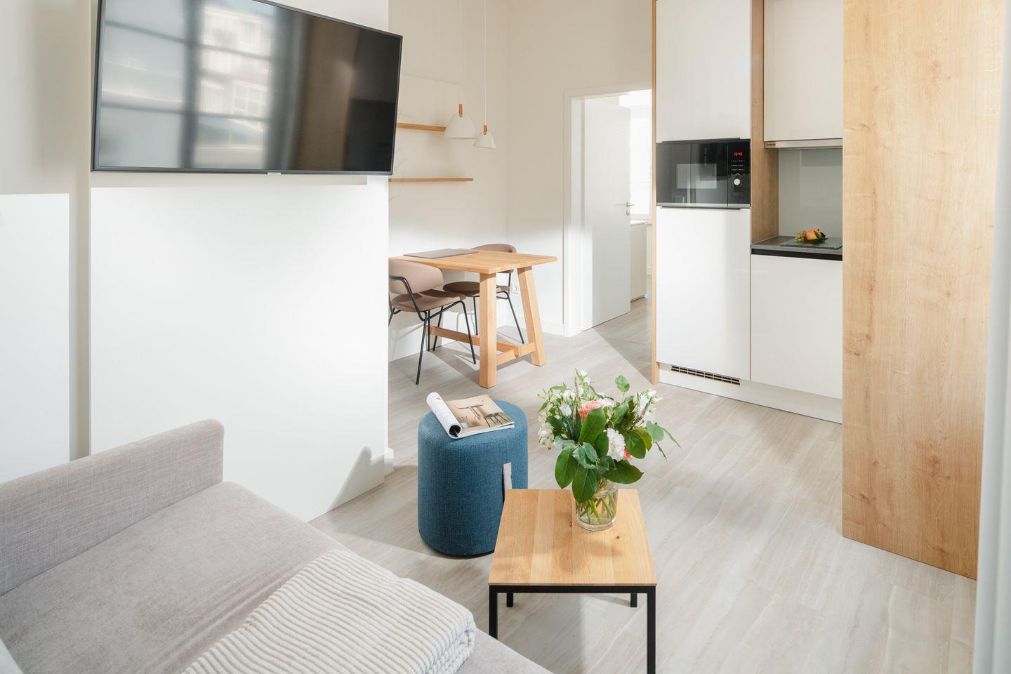 Haupthaus: Die Wohnung H9 liegt im 2. Stock des Haupthauses, welches über einen Aufzug verfügt. Zur Ausstattung der Küche gehören unter anderem ein 2-Platten-Herd sowie eine Mikrowelle, ein Geschirrspüler, eine Filterkaffeemaschine und eine Kapselkaffeemaschine. Fahrräder der Hausgäste können im Innenhof abgestellt werden; Waschmaschine und Wäschetrockner stehen zur gemeinschaftlichen Nutzung im Untergeschoss bereit.