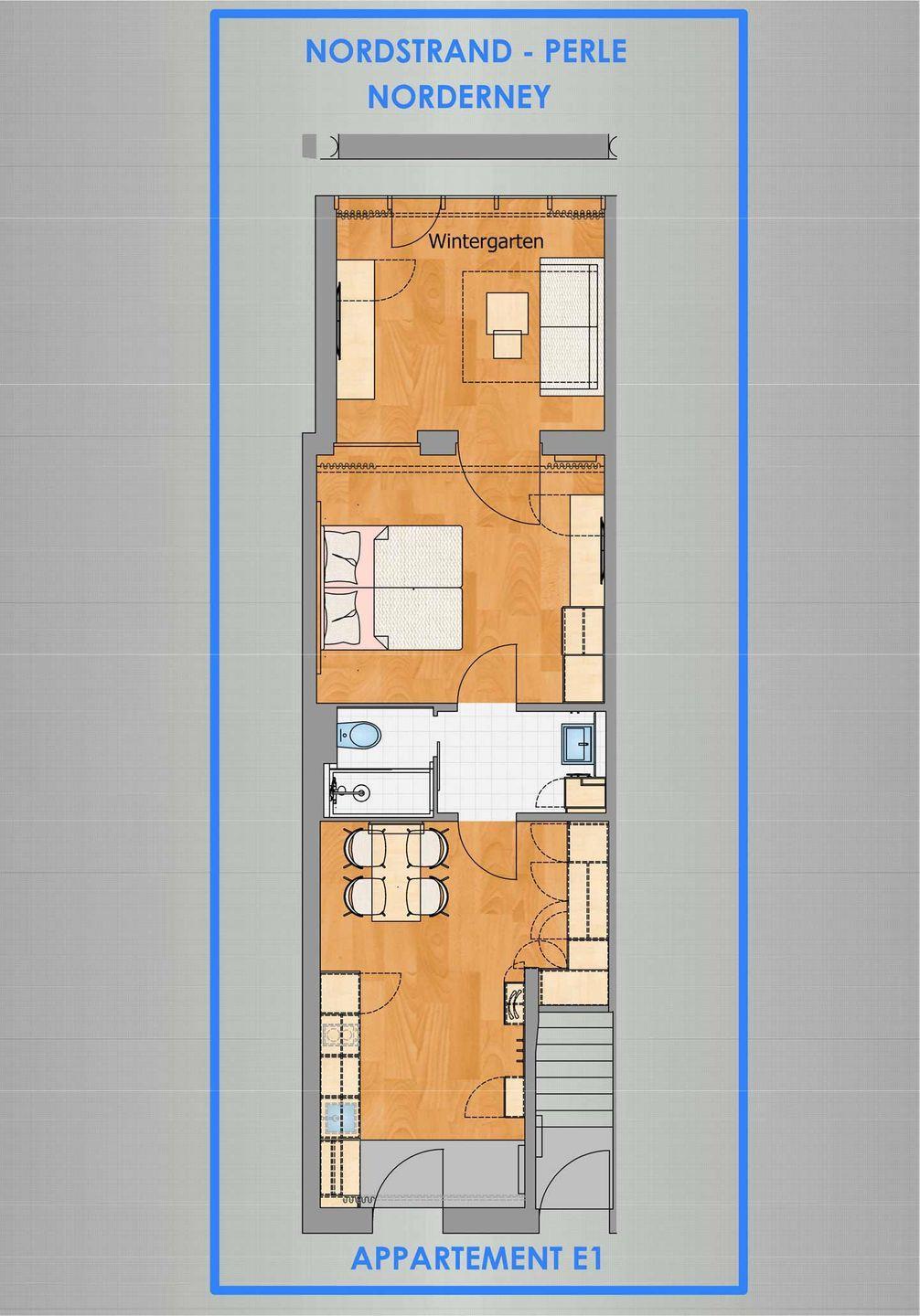 Modernes Apartment E1 in der Nordstrandperle mit Wintergarten und Meerblick, nur 50 m vom Strand entfernt.