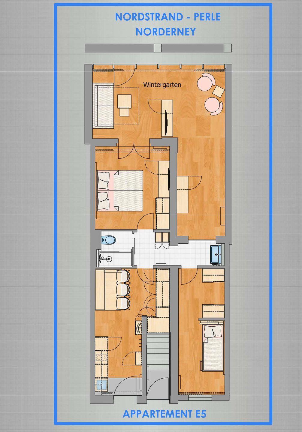 Modernes Apartment E5 in der Nordstrandperle auf Norderney, nah am Meer und der Innenstadt, mit Wintergarten und hochwertiger Ausstattung.