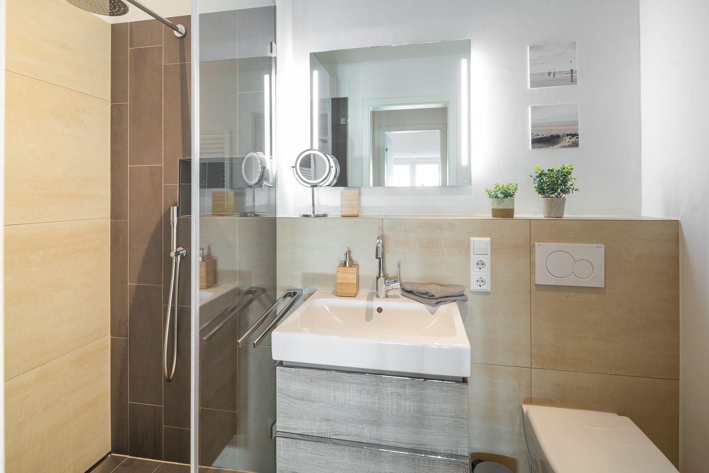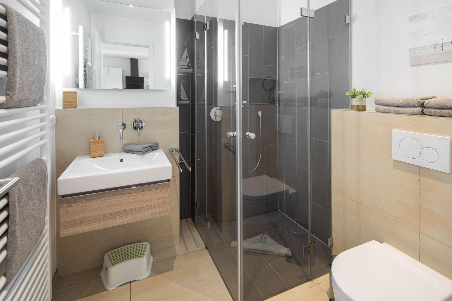 Im Erdgeschoss gelegen, bietet unsere Wohnung zwei gemütliche Schlafzimmer mit jeweils einem Doppelbett der Größe 180x200cmund zwei Badezimmer mit ebenerdiger Dusche, Waschbecken und WC – ideal für bis zu 4 Personen. Für zusätzlichen Komfort sorgt die Fußbodenheizung, die auch an kühleren Tagen für angenehme Wärme sorgt. Außerdem verfügen beide Schlafzimmer über Außenrollos, die eine angenehme Verdunkelung und Privatsphäre bieten. Auch Ihre vierbeinigen Familienmitglieder sind herzlich willkommen (maximal zwei Hunde).