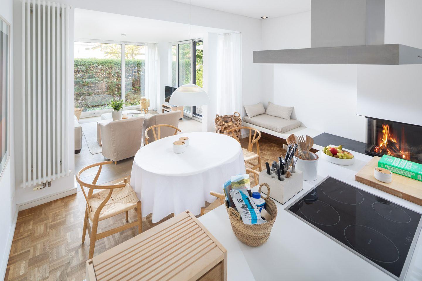Der großzügige Wohnbereich lädt zum Verweilen ein und verfügt über eine offene Küche, einen Essbereich und einen einladenden Kamin, der für wohlige Atmosphäre sorgt. Die hochwertige gemütliche Einrichtung schafft eine warme und einladende Atmosphäre, in der Sie sich sofort wie zu Hause fühlen werden.