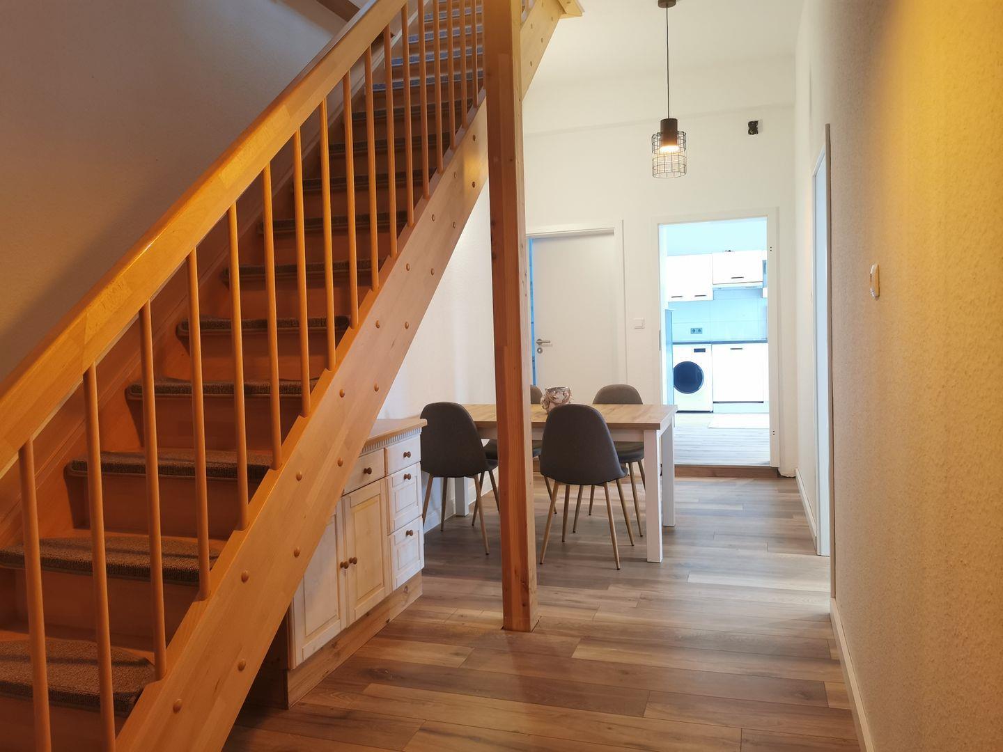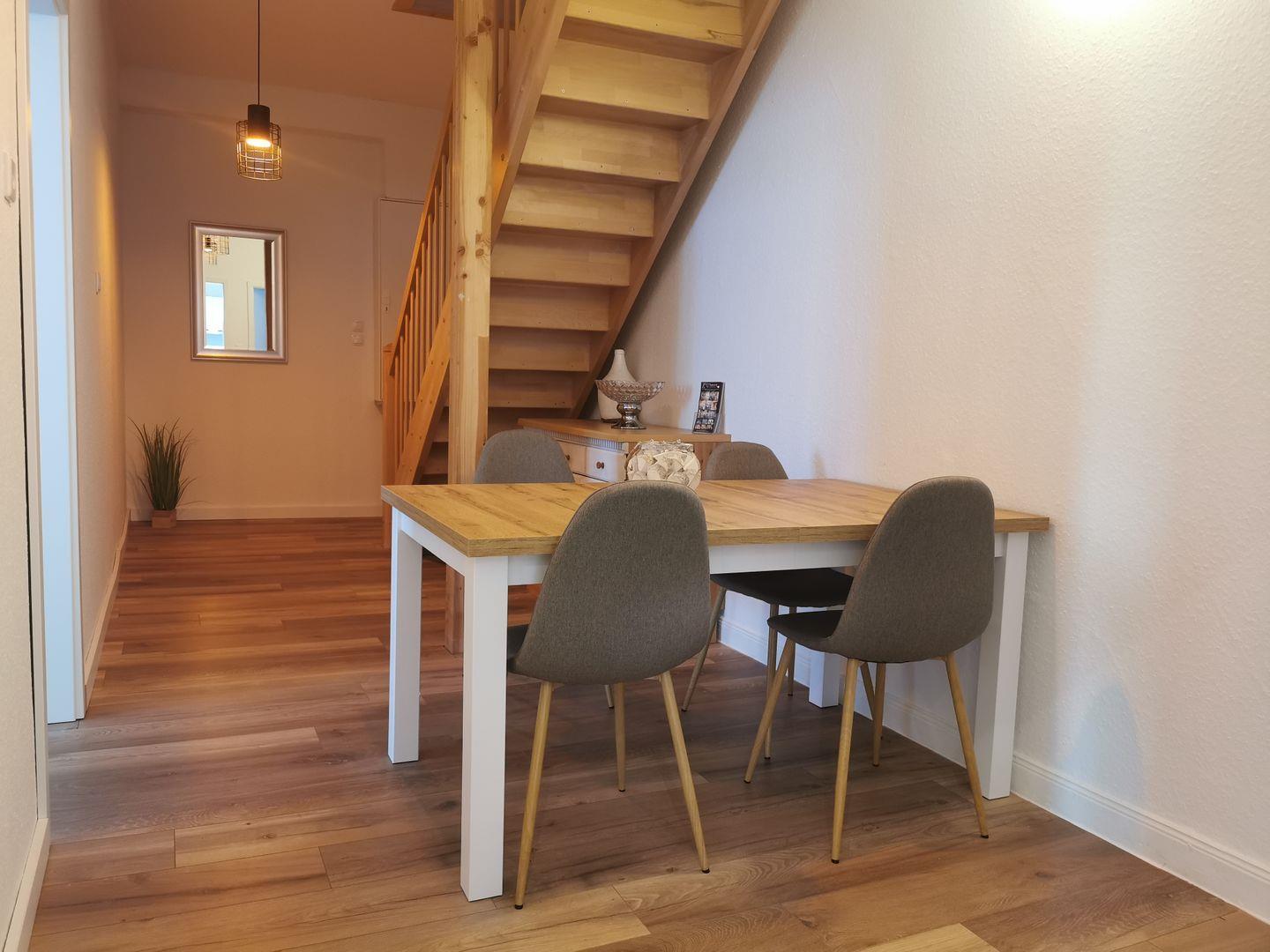 Im Erdgeschoss unter der Treppe ist der Essplatz für 4 Personen mit Blick auf das Wohnzimmer. Die komplett ausgestattete Küche ist separat. Das Maisonnette-Appartement verfügt über 2 Tageslichtbäder mit Dusche/WC im Erdgeschoss. Separater Eingang hinter dem Haus.