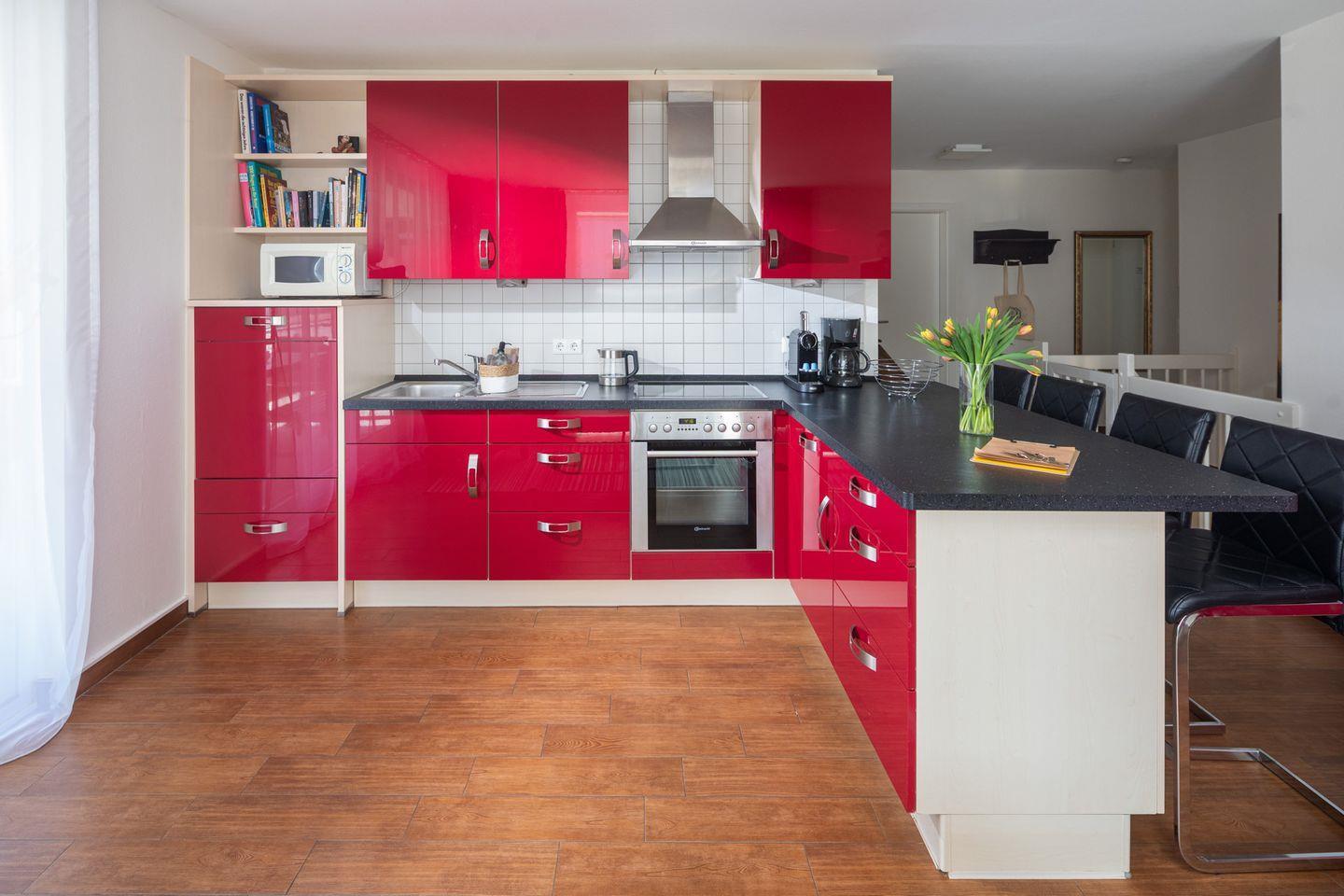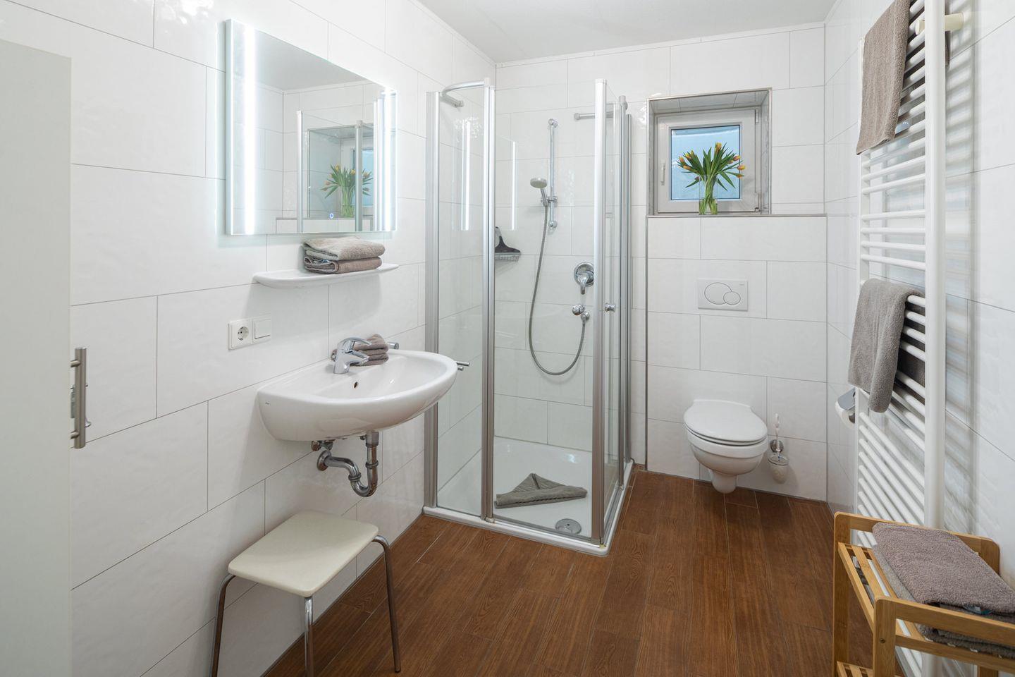 Im Erdgeschoss erwartet Sie ein einladender Wohnbereich mit offener Küche, die mit Cerankochfeld, Backofen, Mikrowelle, Kühlschrank mit Gefrierfach, Geschirrspüler, Kaffeemaschine, Wasserkocher und Toaster umfassend ausgestattet ist. Ebenfalls auf dieser Ebene befinden sich ein Schlafzimmer mit Boxspringbett (180x200cm) und ein modernes Badezimmer mit Badezimmer.?