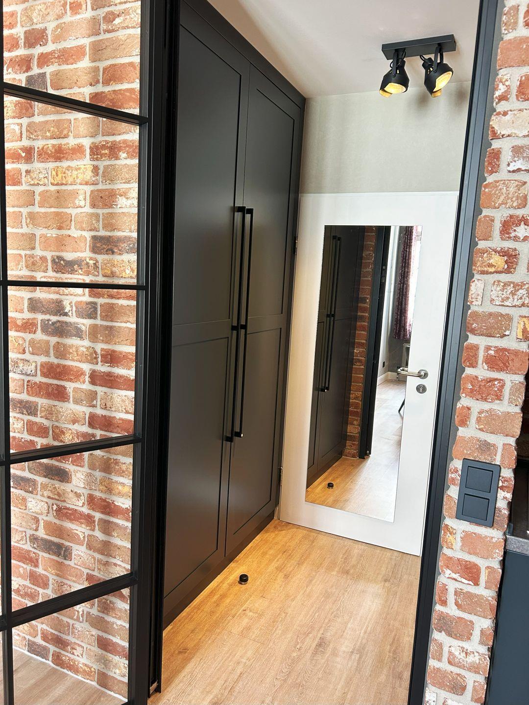 Durch die transparente, schmiedeeiserne Lofttür treten Sie ein in den hohen Wohnraum (3,40 m), in welchem die hochwertig gestalteten Wände in Beton-Optik, mit Klinker-Riemchen und Kalk-Marmor-Putz eine perfekte Symbiose bilden. Hier entspannen Sie im Schlafbereich in einem 180 x 200 cm großen Boxspringbett.