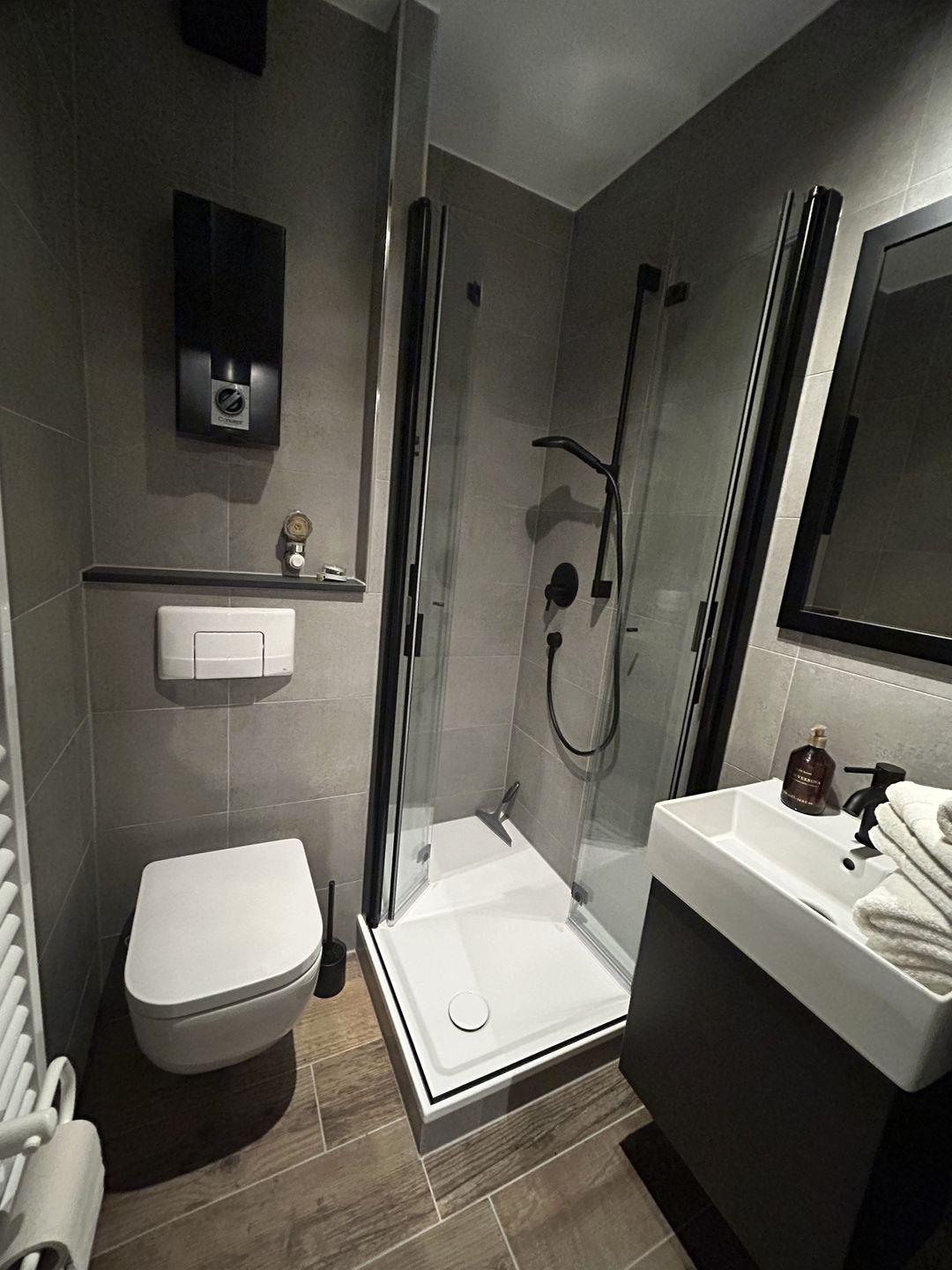 Das hochwertig ausgestattete Bad mit italienischen Fliesen verfügt über Dusche, Waschbecken und WC. Ein Reisefön ist vorhanden.