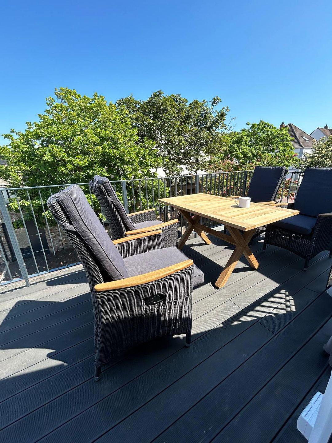 Das Highlight des "Dock 14" ist das zweite Schlafzimmer im Dachgeschoss, von dem aus Sie auf einen wunderschönen Balkon mit 12 qm Fläche gelangen. Genießen Sie die Sonne auf den bequemen Sonnenliegen, entspannen Sie am Tisch mit 4 Stühlen oder schützen Sie sich unter dem Sonnenschirm vor der Mittagshitze.