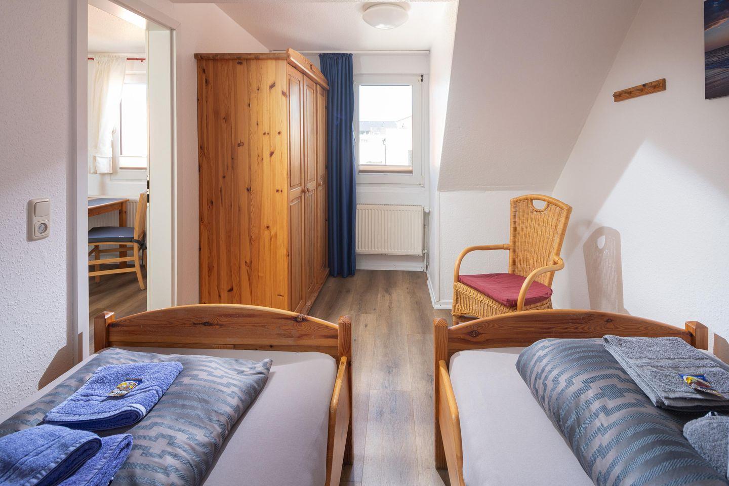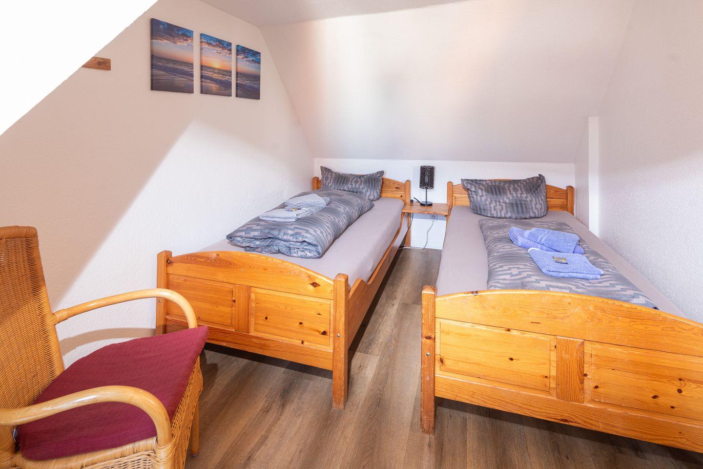 Die 2-Raum-Ferienwohnung im ersten Obergeschoss verfügt über einen Wohn-/Schlafraum mit Schlafsofa (140x200cm), 1 Schlafzimmer mit 2 Einzelbetten (90x200cm), Kabel-TV, Essecke, Küchenzeile (4-Plattenherd, Backofen) und Bad mit Dusche/WC.