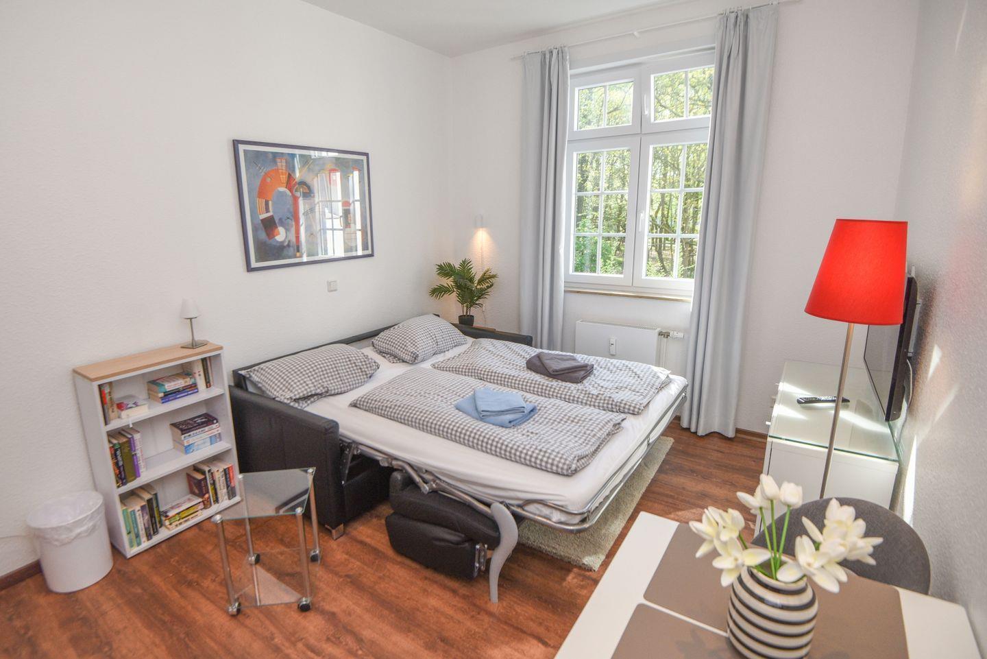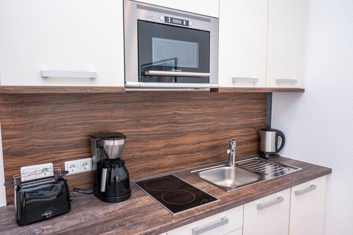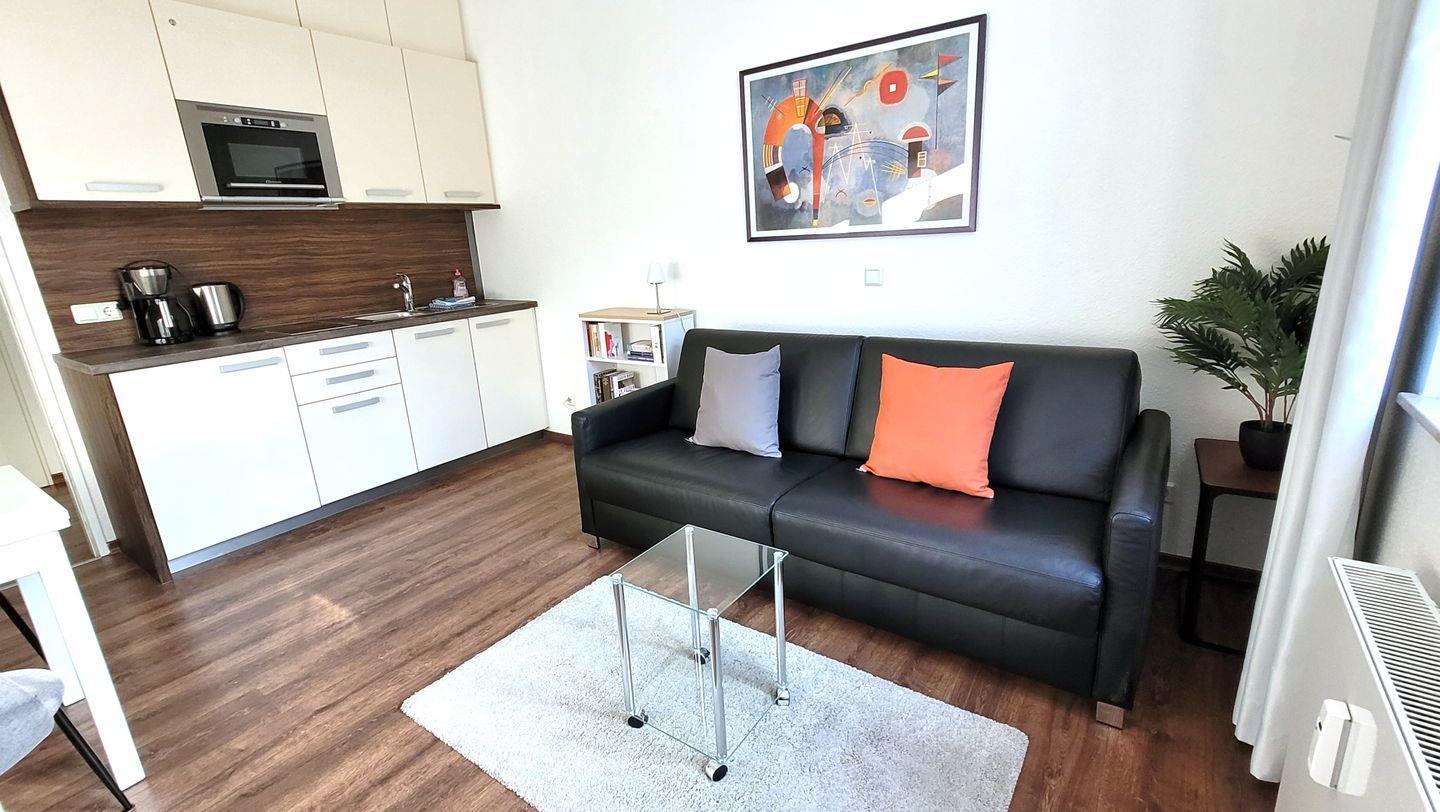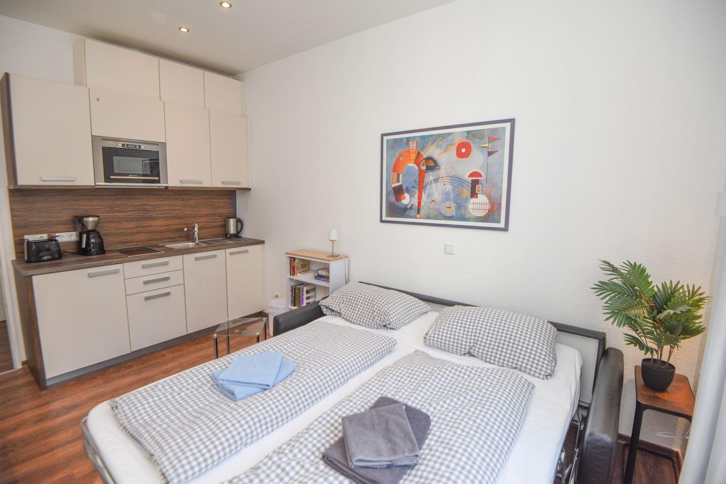 Die Ferienwohnung ist ein Nichtraucherbereich und verfügt über einen hellen Wohn- und Schlafbereich mit Schlafsofa (160x200cm) und einem Esstisch. Die offene Küche ist Teil des Wohnbereichs und ausgestattet mit modernen Geräten, einschließlich eines Induktionsherdes, Kühlschranks, Wasserkochers, Toasters und einer Kaffeemaschine. Geschirr und Besteck sind selbstverständlich vorhanden, sodass Sie sich in Ihrer Ferienwohnung ganz wie zu Hause fühlen können.