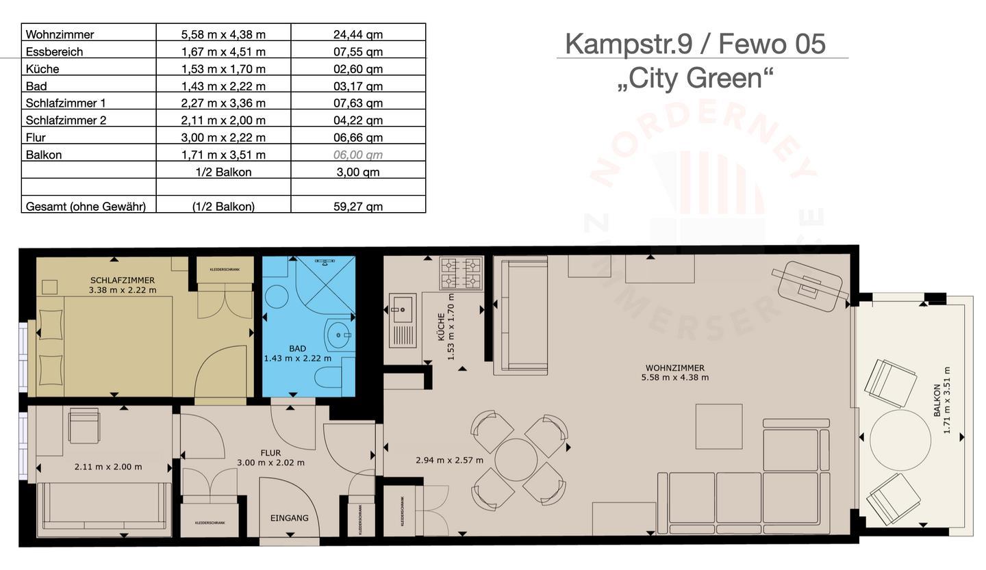 Die Ferienwohnung "City Green" auf Norderney liegt in der Kampstraße 9, nur 450 Meter vom Strand entfernt.