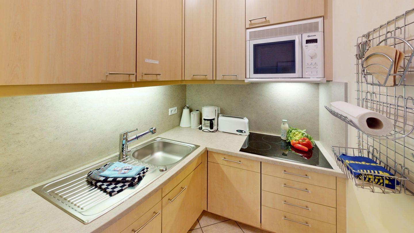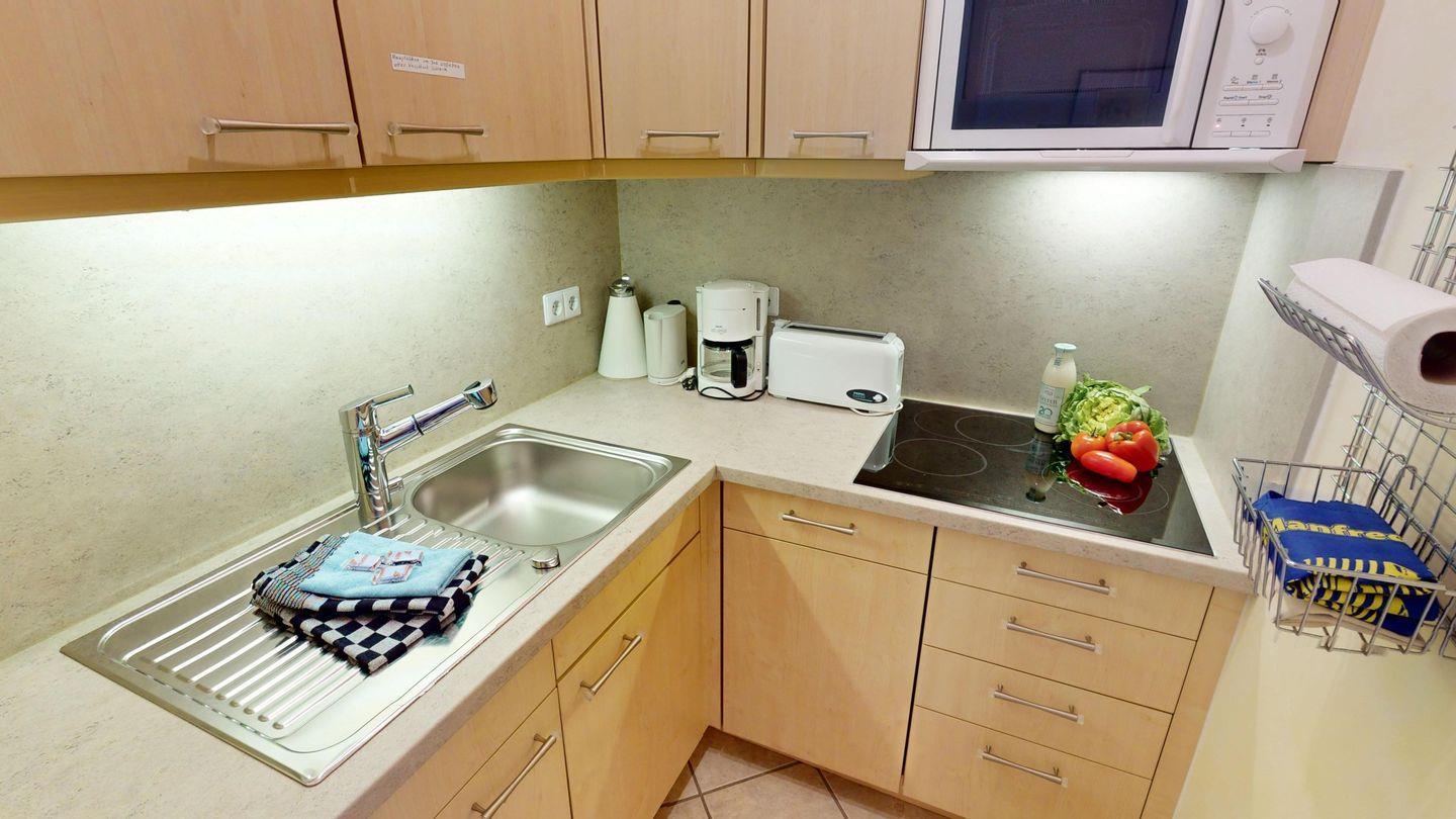 Diese Ferienwohnung im Parterre bietet auf 55 m² ausreichend Platz für bis zu drei Personen und ist ideal für Paare und kleine Familien. Die Wohnung verfügt über 2 Schlafzimmer, eines mit einem Doppelbett und das andere mit einem Einzelbett ausgestattet. Die voll ausgestattete Küche wurde mit einem Kühlschrank mit Gefrierfach, einer Spülmaschine, einer Mikrowelle und einer Kaffeemaschine eingerichtet. Weiter befinden sich ein Toaster, ein Eierkocher und ein Wasserkocher in dieser Küche.