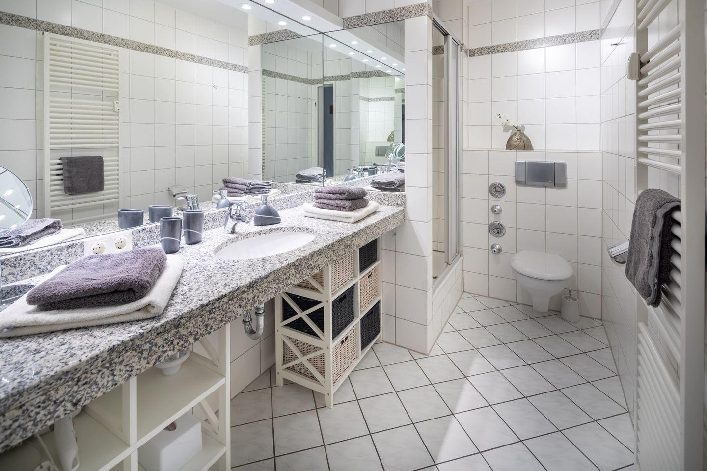 Das Badezimmer ist modern eingerichtet und verfügt über einen großen Waschtisch mit Ablage, Dusche, WC, Haartrockner und Handtuchtrockner.