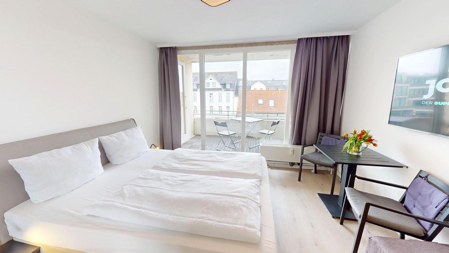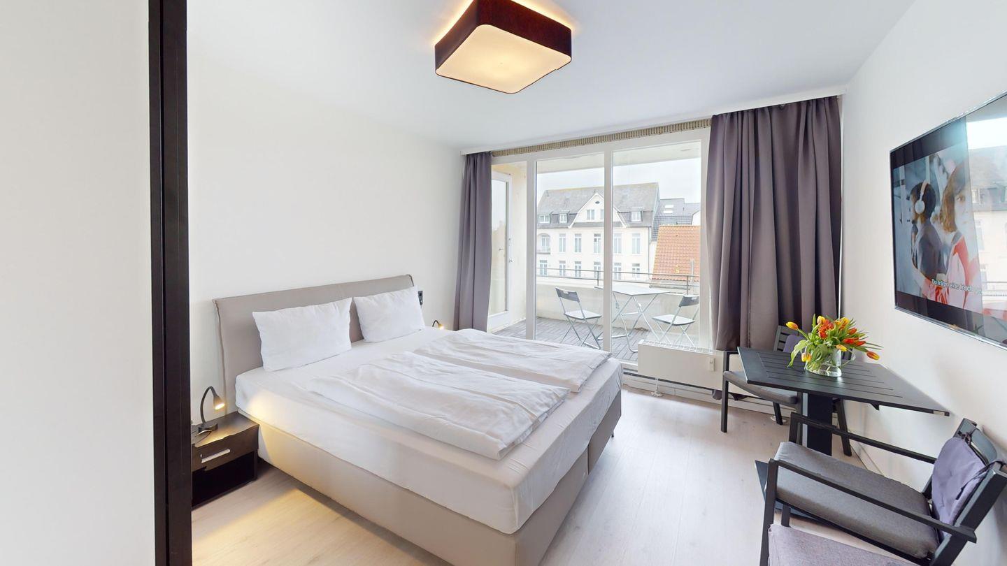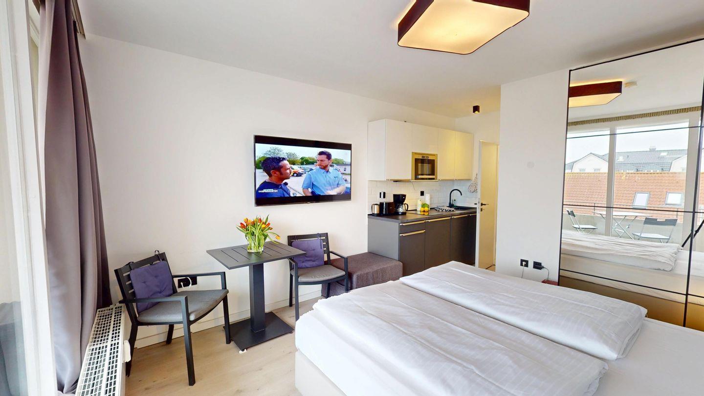 Die 1-Zimmer-Wohnung mit ca. 15 qm ist nach Süden zur Landseite ausgerichtet und wurde mit einem Doppelbett (1,80m x 2,00m) ausgestattet. Das Badezimmer ist mit einer Dusche und mit einer Fußbodenheizung ausgestattet. Ein Balkon (ca. 3 qm) gehört ebenfalls zur Wohnung. Die Wohnung wurde mit verdunkelnden Vorhängen eingerichtet. Im Haus stehen eine Waschmaschine und ein Trockner (gemeinschaftlich gegen Gebühr) zur Verfügung.