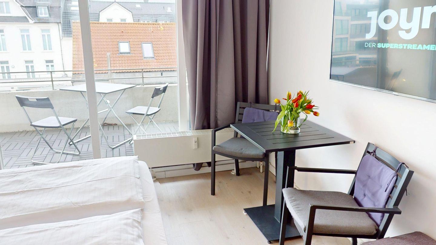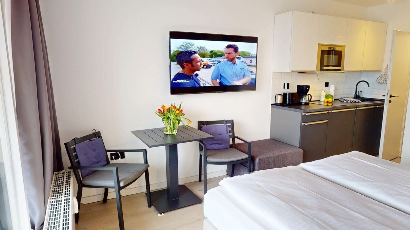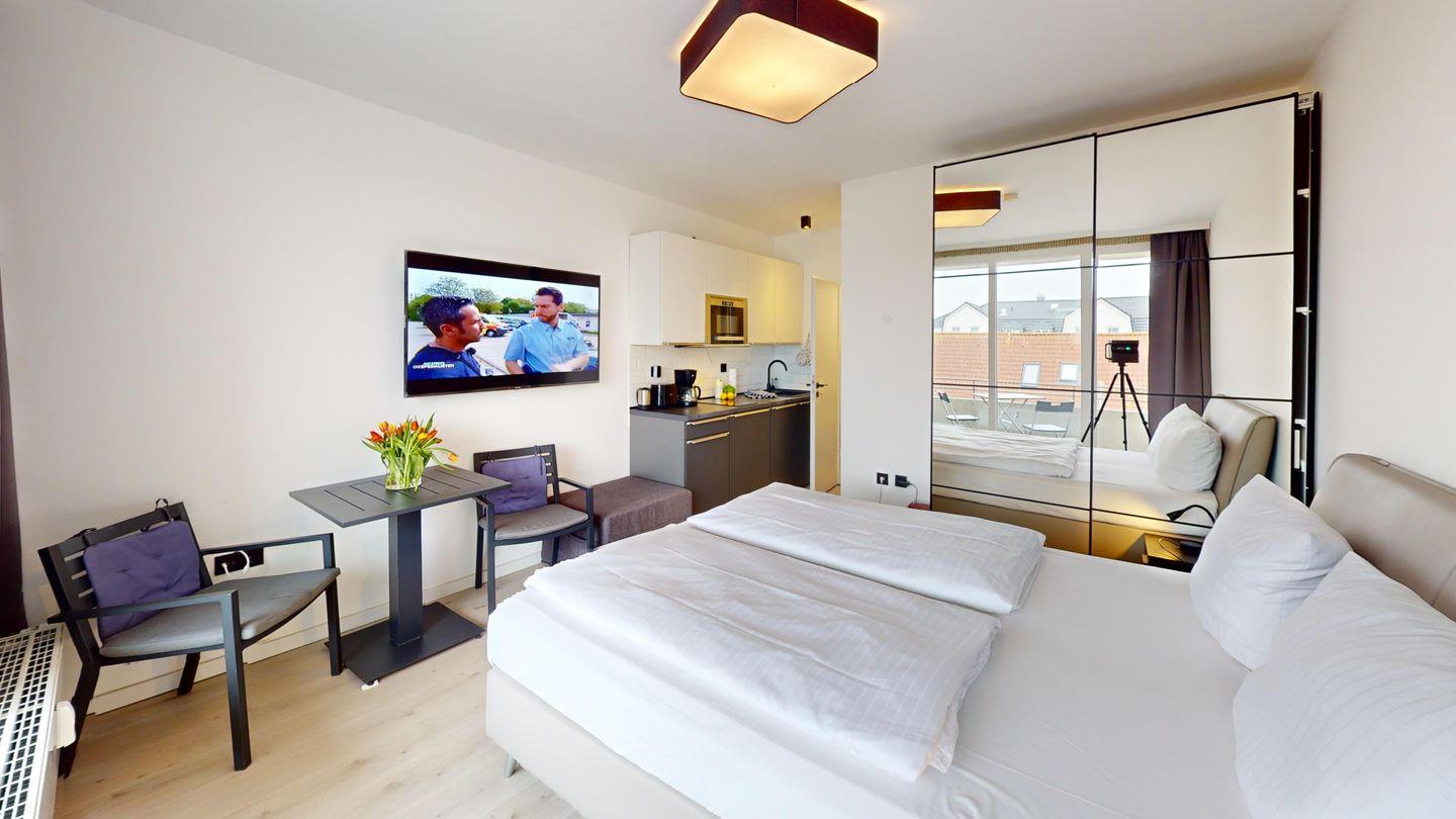 Die 1-Zimmer-Wohnung mit ca. 15 qm ist nach Süden zur Landseite ausgerichtet und wurde mit einem Doppelbett (1,80m x 2,00m) ausgestattet. Das Badezimmer ist mit einer Dusche und mit einer Fußbodenheizung ausgestattet. Ein Balkon (ca. 3 qm) gehört ebenfalls zur Wohnung. Die Wohnung wurde mit verdunkelnden Vorhängen eingerichtet. Im Haus stehen eine Waschmaschine und ein Trockner (gemeinschaftlich gegen Gebühr) zur Verfügung.