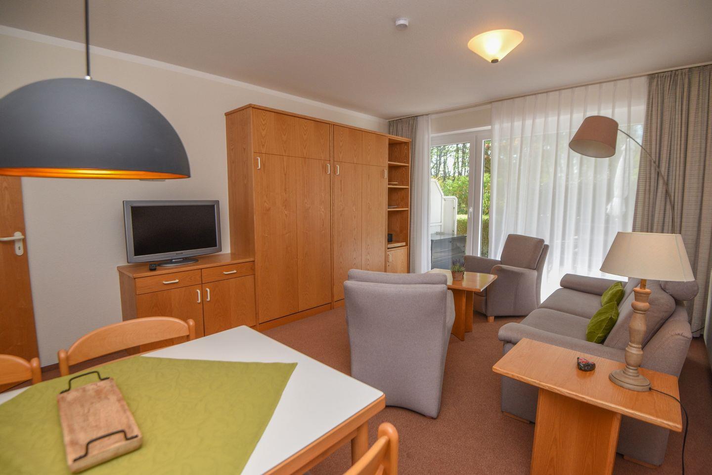 Die Ferienwohnung verfügt über ein geschmackvoll eingerichtetes Schlafzimmer, ein helles Wohnzimmer und ein voll ausgestattetes, geschlossenes Küchen-Café. Die Küche lässt keine Wünsche offen: hier findest du alles, was du für deine Selbstversorgung benötigst, darunter Herd, Mikrowelle, Kühlschrank, Spülmaschine und zahlreiche Küchenutensilien. Nach einem aufregenden Tag an der frischen Luft kannst du im einladenden Essbereich die gemeinsame Zeit bei einem leckeren Abendessen genießen.
