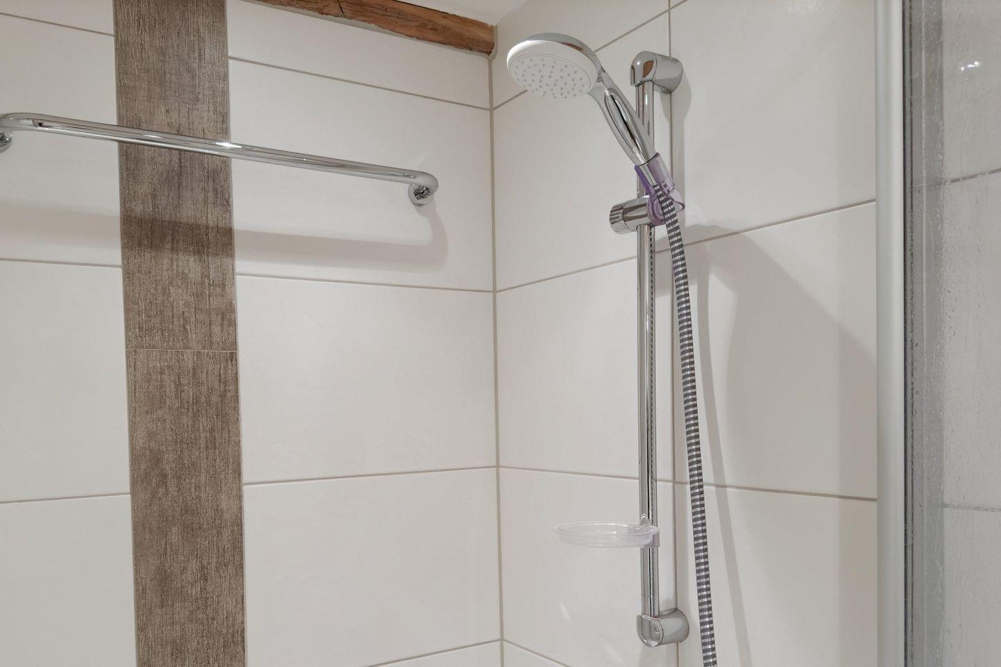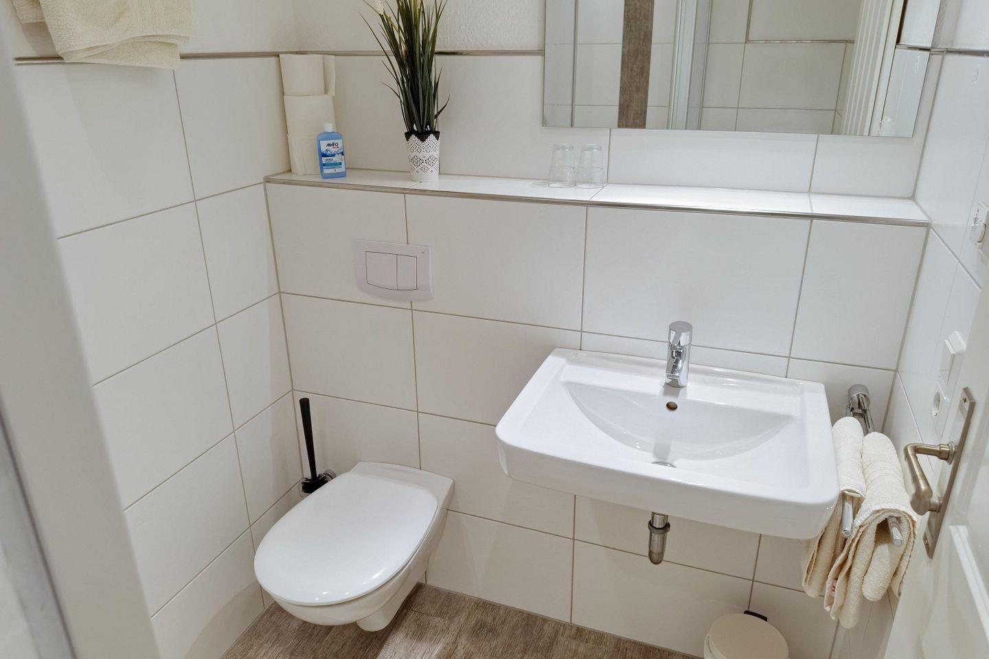 Das moderne Badezimmer ist funktional gestaltet und verfügt über eine Dusche, ein Waschbecken und ein WC. Zusätzlicher Komfort wird durch einen Kosmetikspiegel und eine Erstausstattung mit Handtüchern und Bettwäsche geboten.