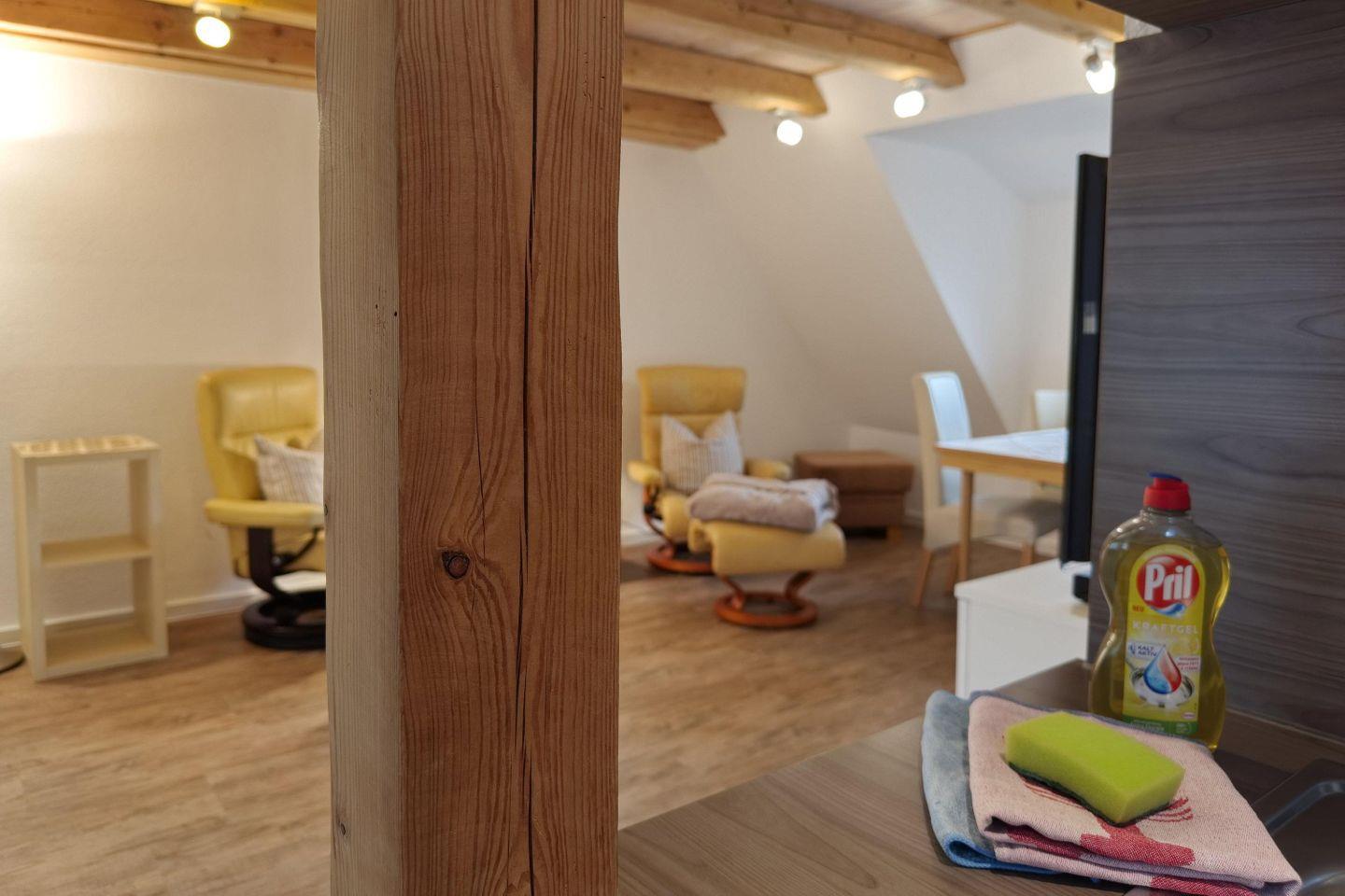Das gemütliche Schlafzimmer mit stilvollem Parkettboden sorgt für eine angenehme Atmosphäre. Im hellen Wohnzimmer lädt ein komfortables Sofa zum Entspannen ein – es lässt sich bei Bedarf in eine zusätzliche Schlafgelegenheit verwandeln. Der angrenzende Essbereich bietet Platz für gemeinsame Mahlzeiten, und in der gut ausgestatteten Kochnische findest du alles, was du brauchst: Kühlschrank, Herd, Backofen, Mikrowelle sowie praktische Küchenutensilien und Geschirr.