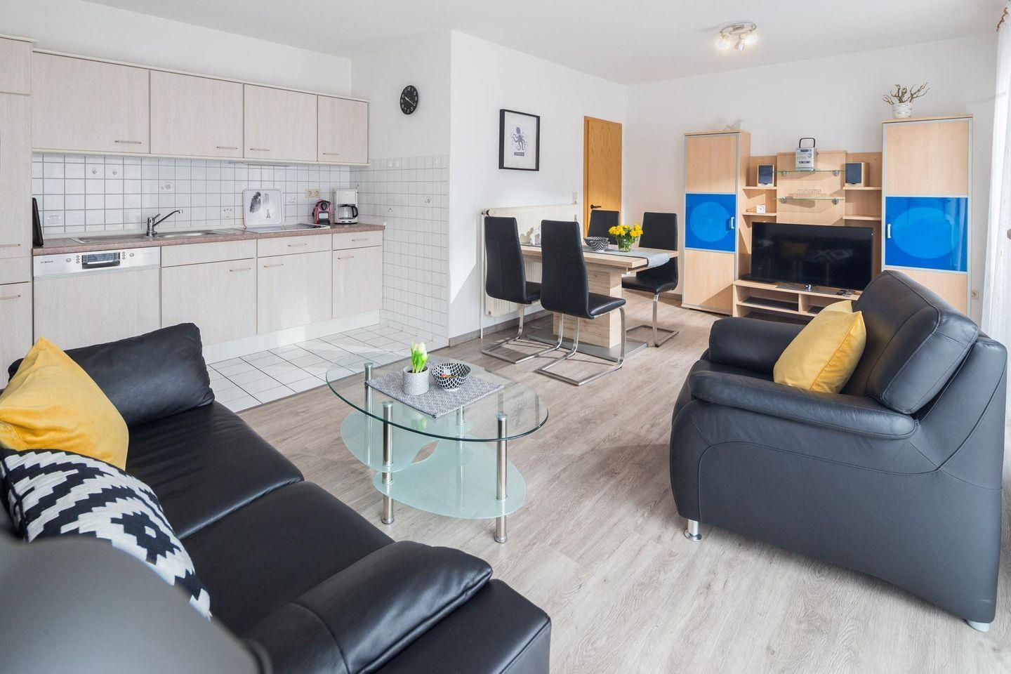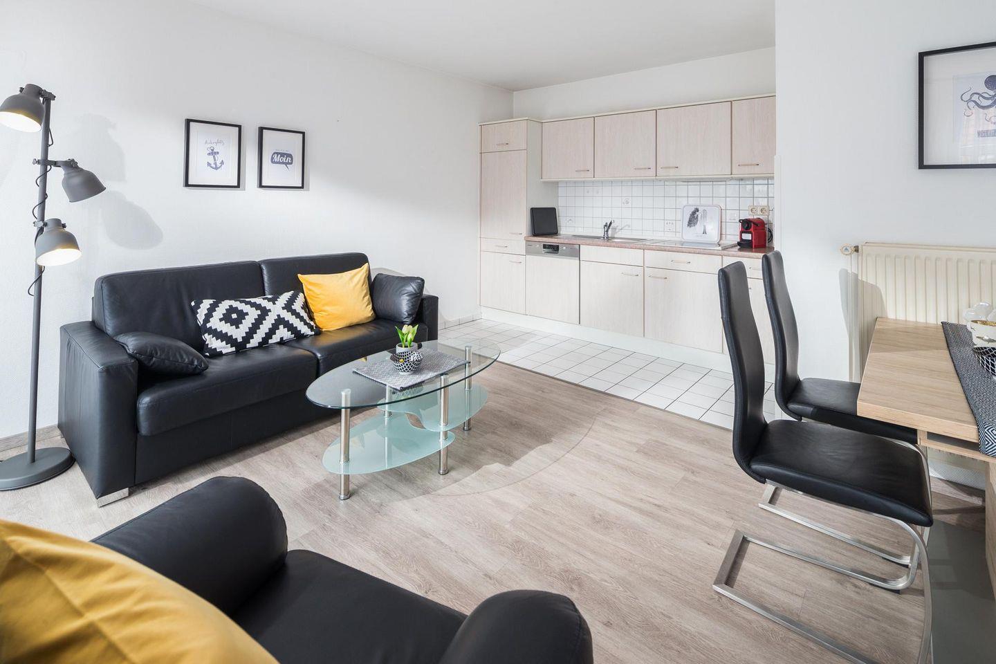 Die Wohnung verfügt über zwei komfortable Schlafzimmer, ein modernes Badezimmer und einen einladenden Wohnbereich, der sich ideal für gesellige Abende eignet. Die gemütliche Wohnlandschaft lädt zum Entspannen ein – ob mit einem guten Buch oder bei einem Glas Wein am Abend.