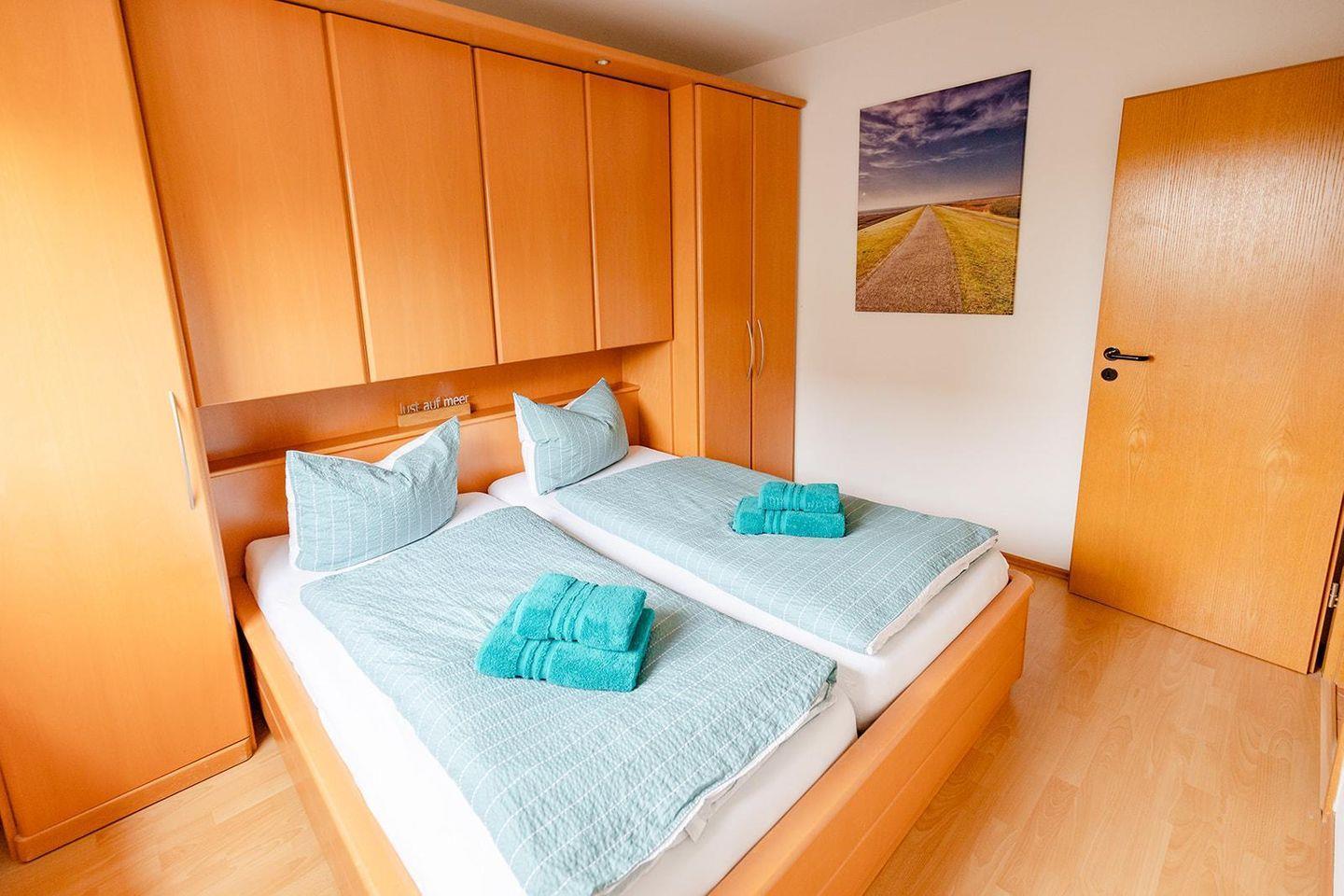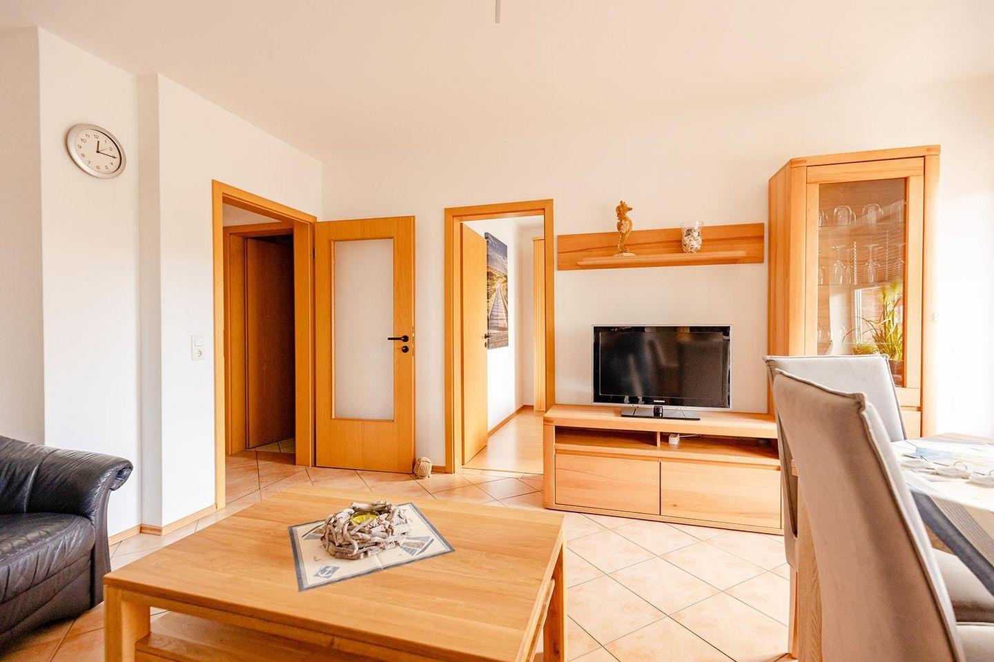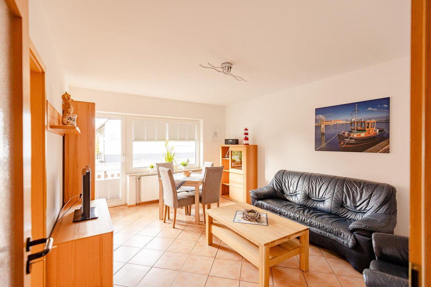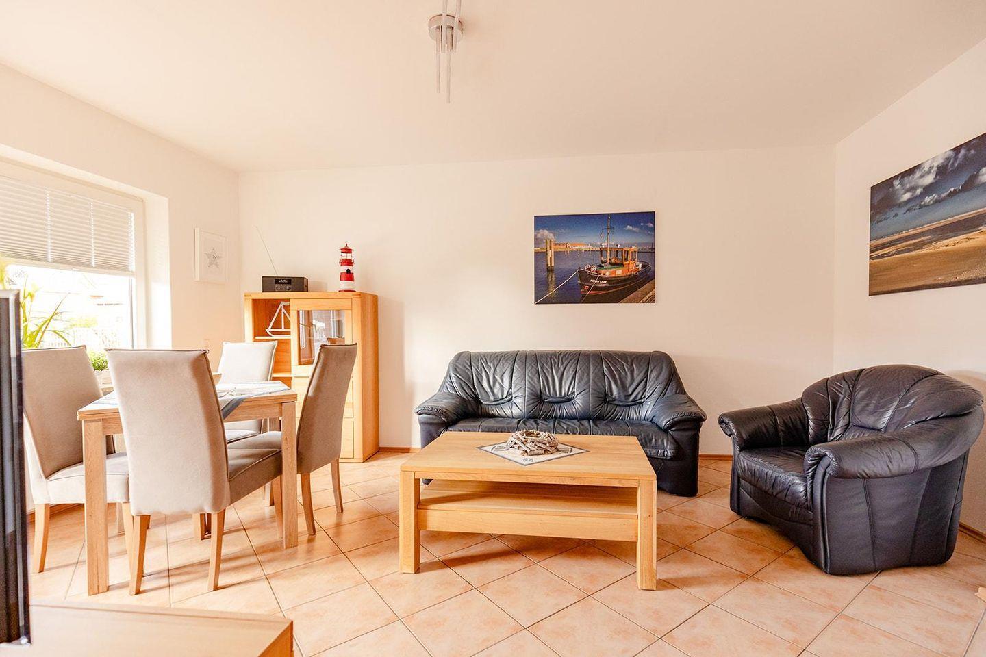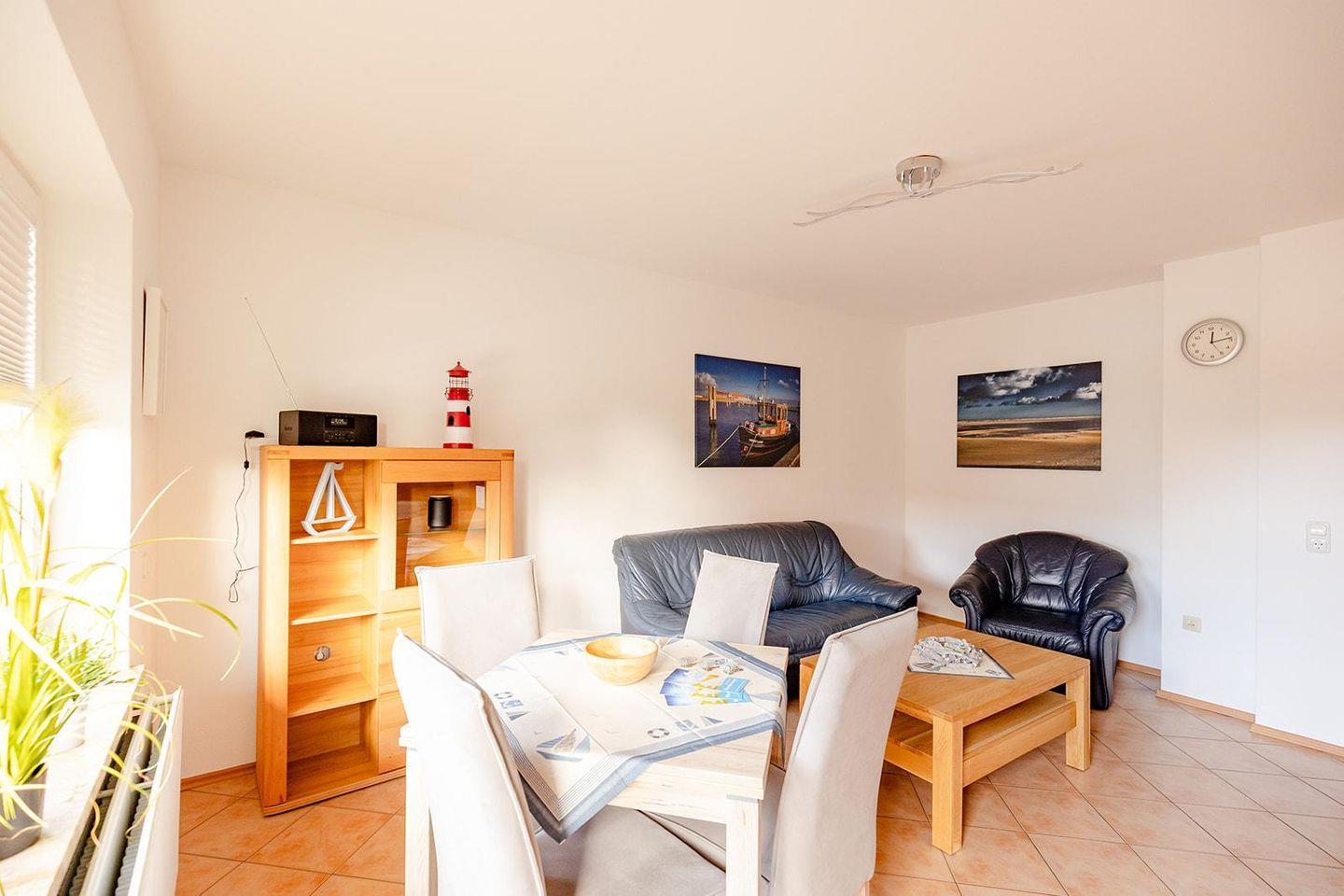 Zwei komfortable Schlafzimmer laden nach einem erlebnisreichen Tag zum Entspannen ein. Das helle Wohnzimmer mit gemütlicher Sofaecke ist perfekt für entspannte Abende, und am Esstisch kannst du gemeinsam genießen. Ein Highlight ist der Balkon – ideal, um frische Nordseeluft zu schnappen und den Tag mit einem Glas Wein ausklingen zu lassen.