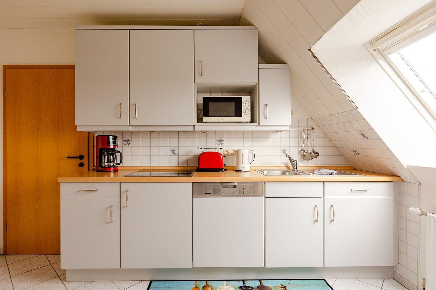Zwei gemütliche Schlafzimmer sorgen für erholsame Nächte, während das helle Wohnzimmer mit Sofaecke und TV zum Entspannen einlädt. Die geschlossene, voll ausgestattete Küche mit Cerankochfeld, Geschirrspüler, Kühlschrank, Mikrowelle und Kaffeemaschine lässt keine Wünsche offen – ideal für gemeinsame Mahlzeiten am Esstisch.