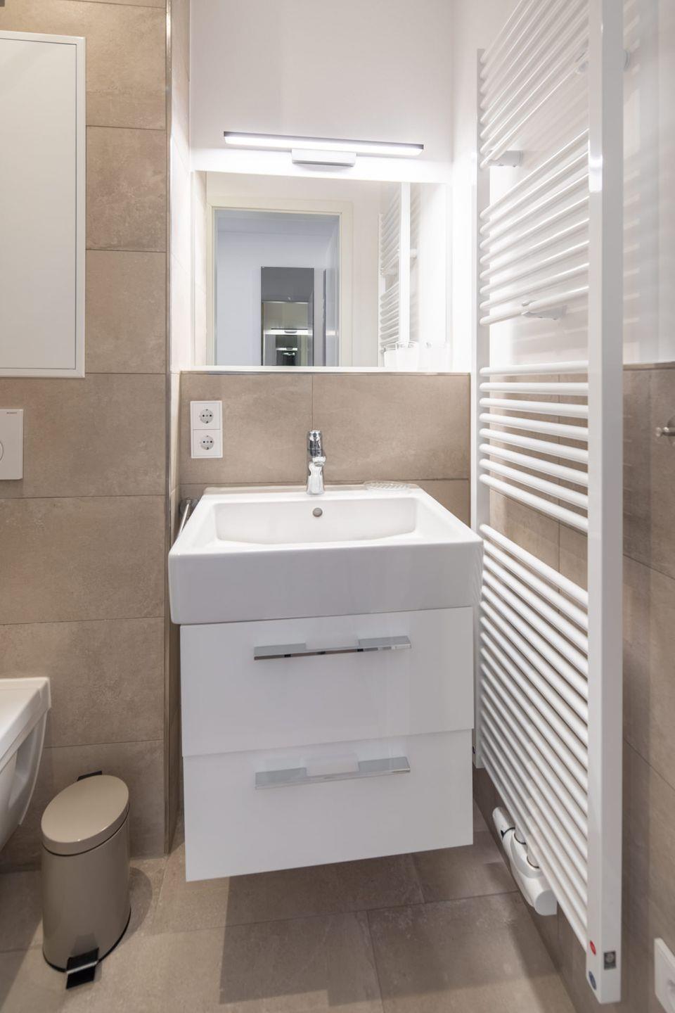 Das Badezimmer wurde modern gestaltet und ist mit einer ebenerdigen Dusche ausgestattet. Hochwertige Armaturen, ausreichend Stauraum und ein klares Design schaffen ein rundum angenehmes Raumgefühl.