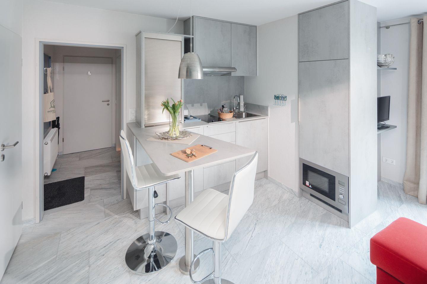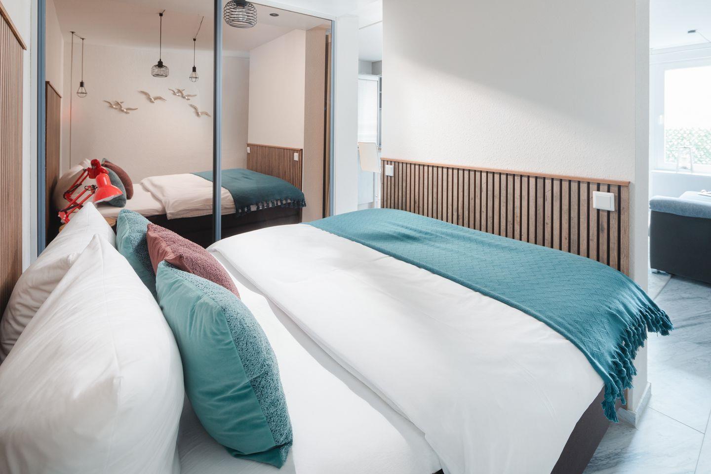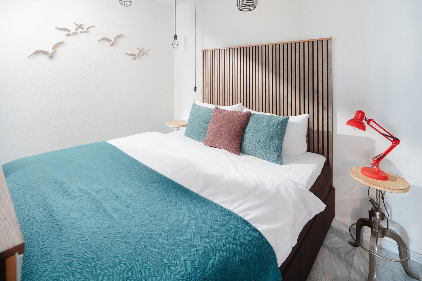 Die 2024 renovierte Wohnung verfügt über ein Schlafzimmer mit Doppelbett (160x200cm) sowie ein offenes Wohnzimmer mit integrierter Küche. Die voll ausgestattete Küche umfasst eine Spülmaschine, ein Ceranfeld, eine Mikrowelle, einen Wasserkocher, eine Kaffeemaschine, Eierkocher und einen Toaster. Außenjalousien sorgen für eine angenehme Verdunklung.