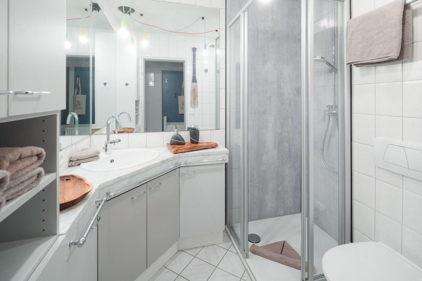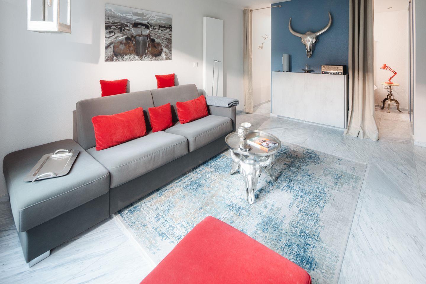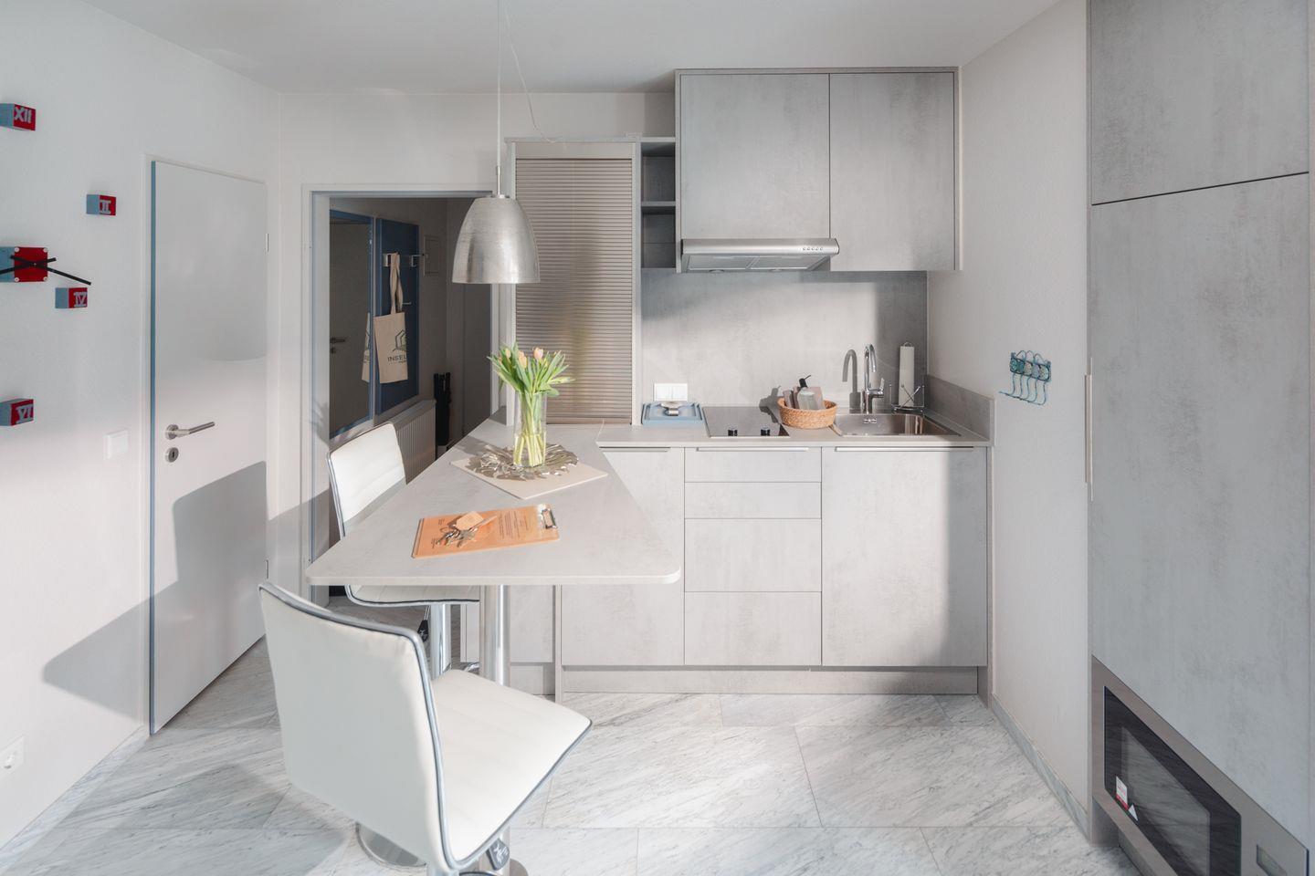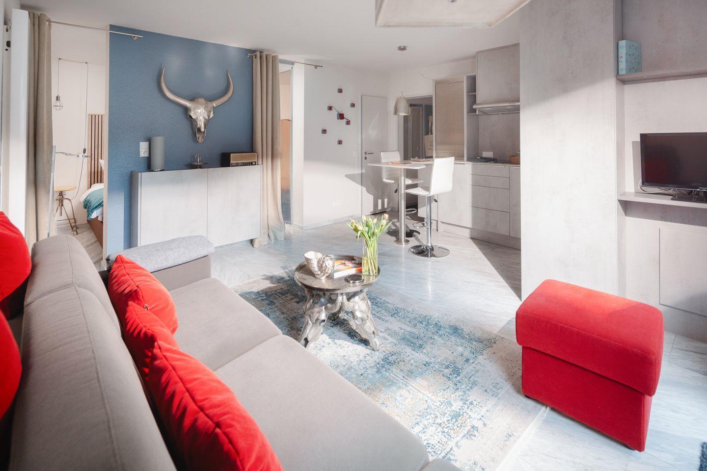 Die 2024 renovierte Wohnung verfügt über ein Schlafzimmer mit Doppelbett (160x200cm) sowie ein offenes Wohnzimmer mit integrierter Küche. Die voll ausgestattete Küche umfasst eine Spülmaschine, ein Ceranfeld, eine Mikrowelle, einen Wasserkocher, eine Kaffeemaschine, Eierkocher und einen Toaster. Außenjalousien sorgen für eine angenehme Verdunklung.