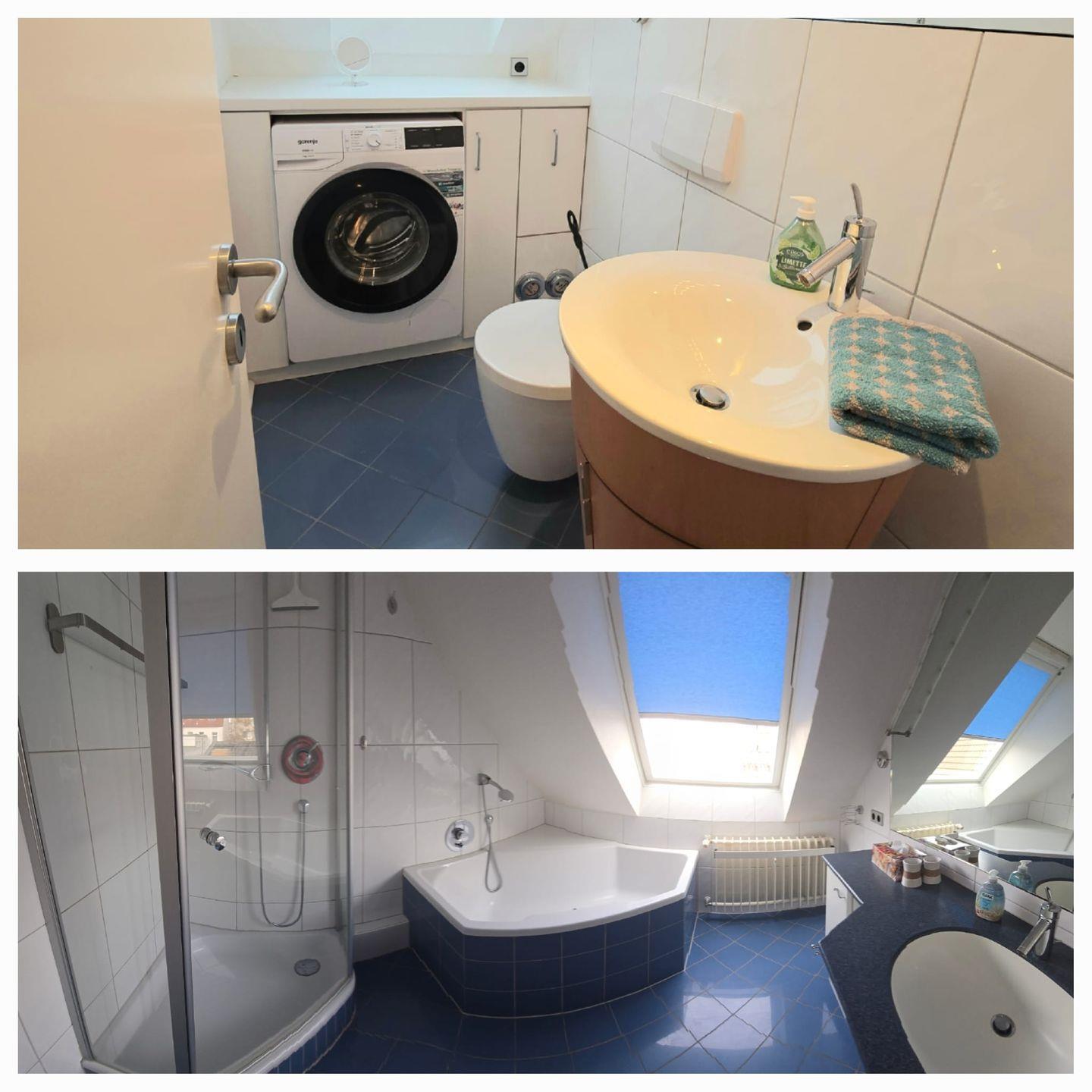Es gibt ein Bad mit Dusche und Badewanne. Die Spiegelfläche vermittelt ein