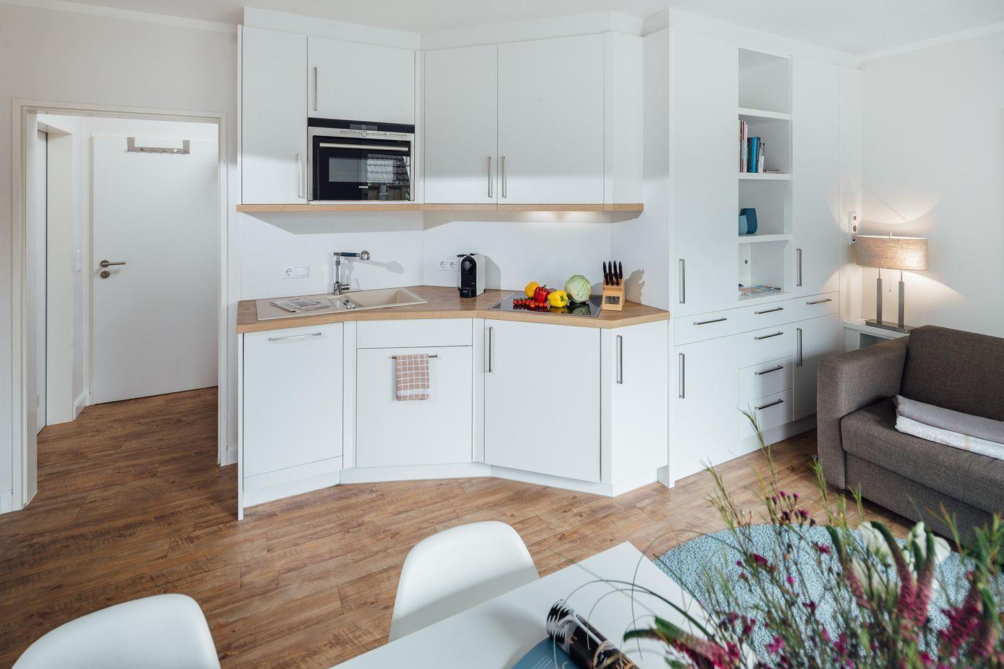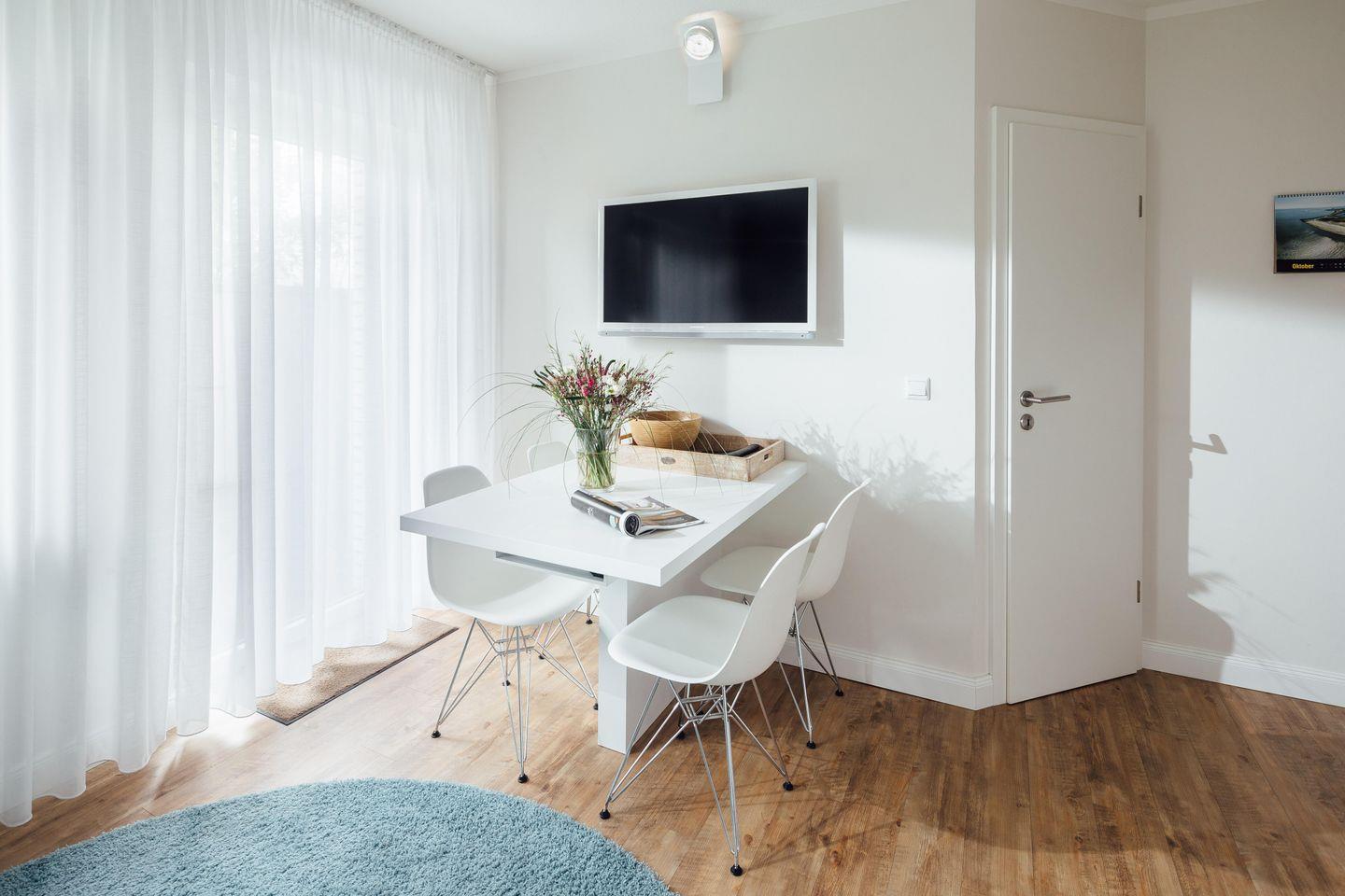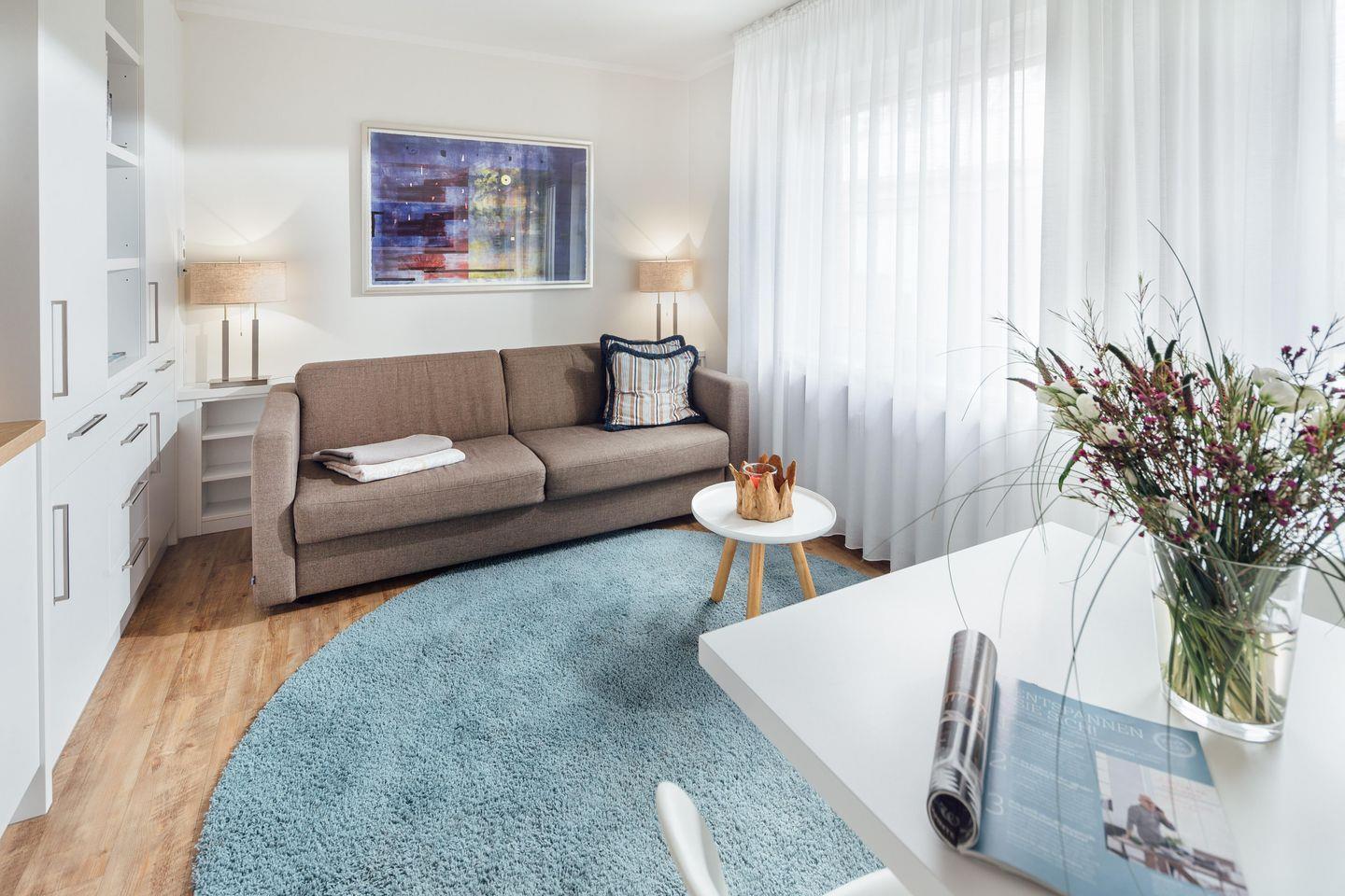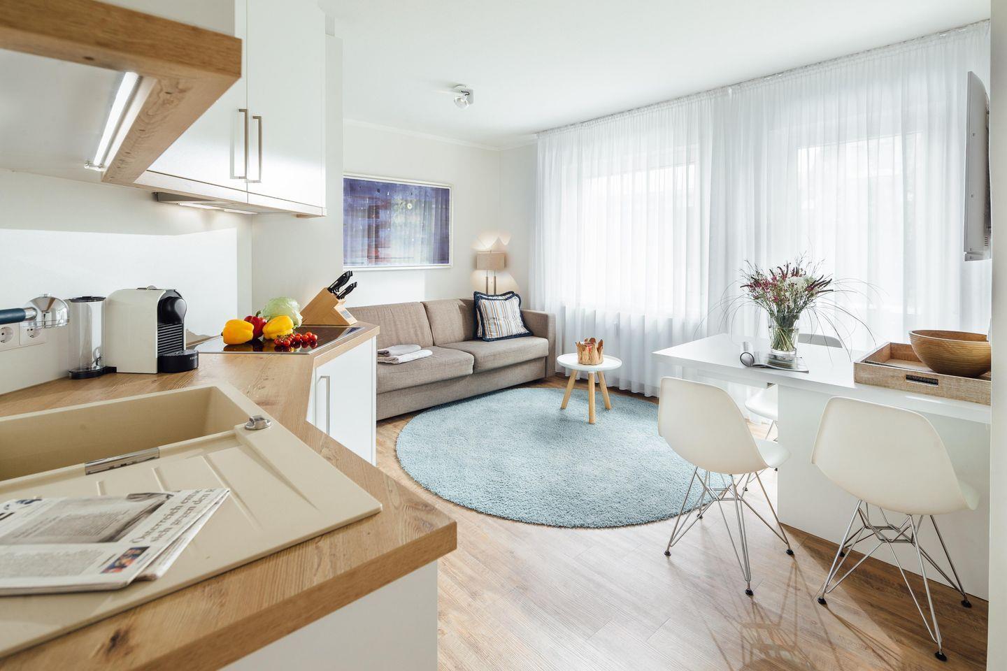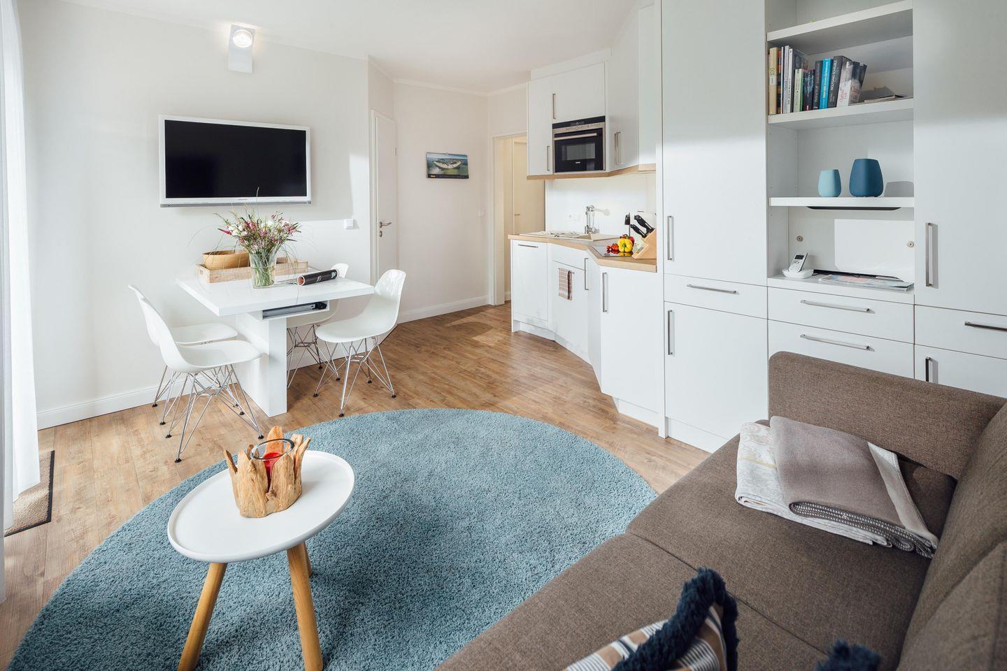 Das Schlafzimmer ist mit einem Doppelbett (1,80 m x 2,00 m) ausgestattet. Der Wohnbereich verfügt über eine Schlafcouch (2,00 m x 2,20 m), so dass ein weiterer Schlafplatz vorhanden ist. Weiterhin ist in dem Wohnbereich eine komplett ausgestattete Küche integriert inklusive Essbereich. Ein kleines Highlight der Wohnung ist die ca. 20 Quadratmeter große Terrasse. Die Fenster und die Terrassentür können mit Außenjalousien verdunkelt werden.