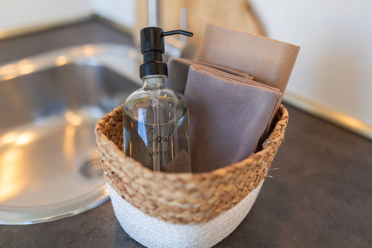 Die offene Küche ist komplett ausgestattet: Backofen, Cerankochfeld, Geschirrspüler, Kaffeemaschine, Wasserkocher, Toaster, Kochzubehör – alles da, was du brauchst. Ob du dir schnell ein Frühstück machst oder abends ein Menü zauberst – hier kocht es sich mit Meerblick-Gefühl.