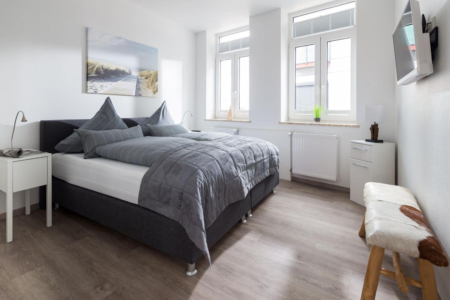Im separaten Schlafzimmer wartet ein hochwertiges Boxspringbett auf euch – für tiefe Erholung nach langen Strandspaziergängen. Das moderne Bad mit Fenster, ebenerdiger Duschwanne, großzügigem Waschtisch und Vergrößerungsspiegel macht den Start in den Tag besonders angenehm. Ein Föhn ist natürlich vorhanden.