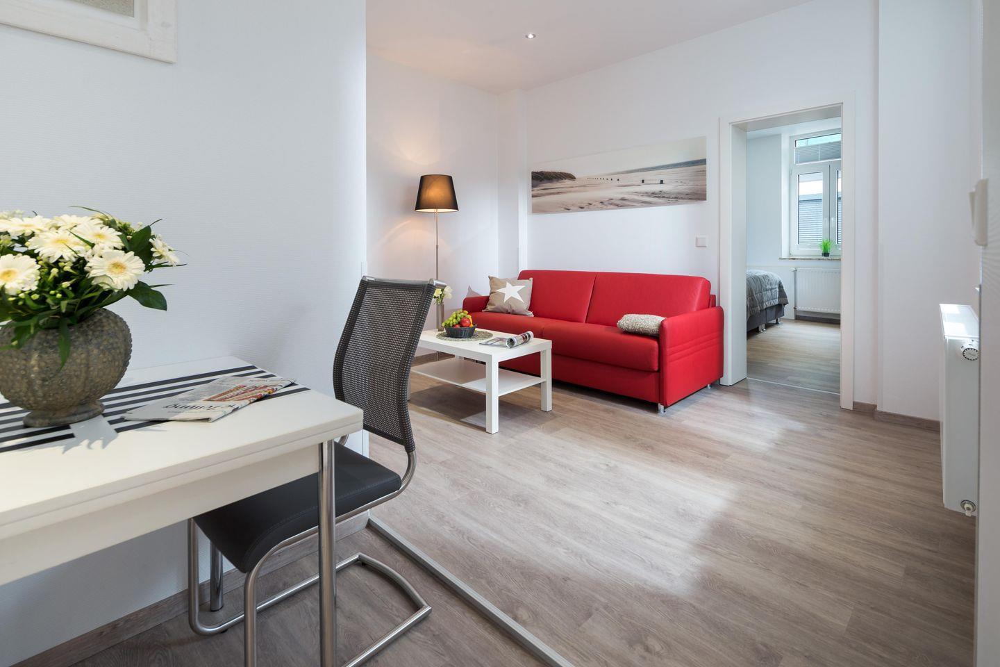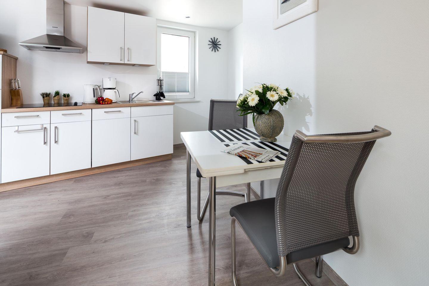 Gemütliche Ferienwohnung auf Norderney mit Terrasse, moderner Küche und komfortablem Boxspringbett.