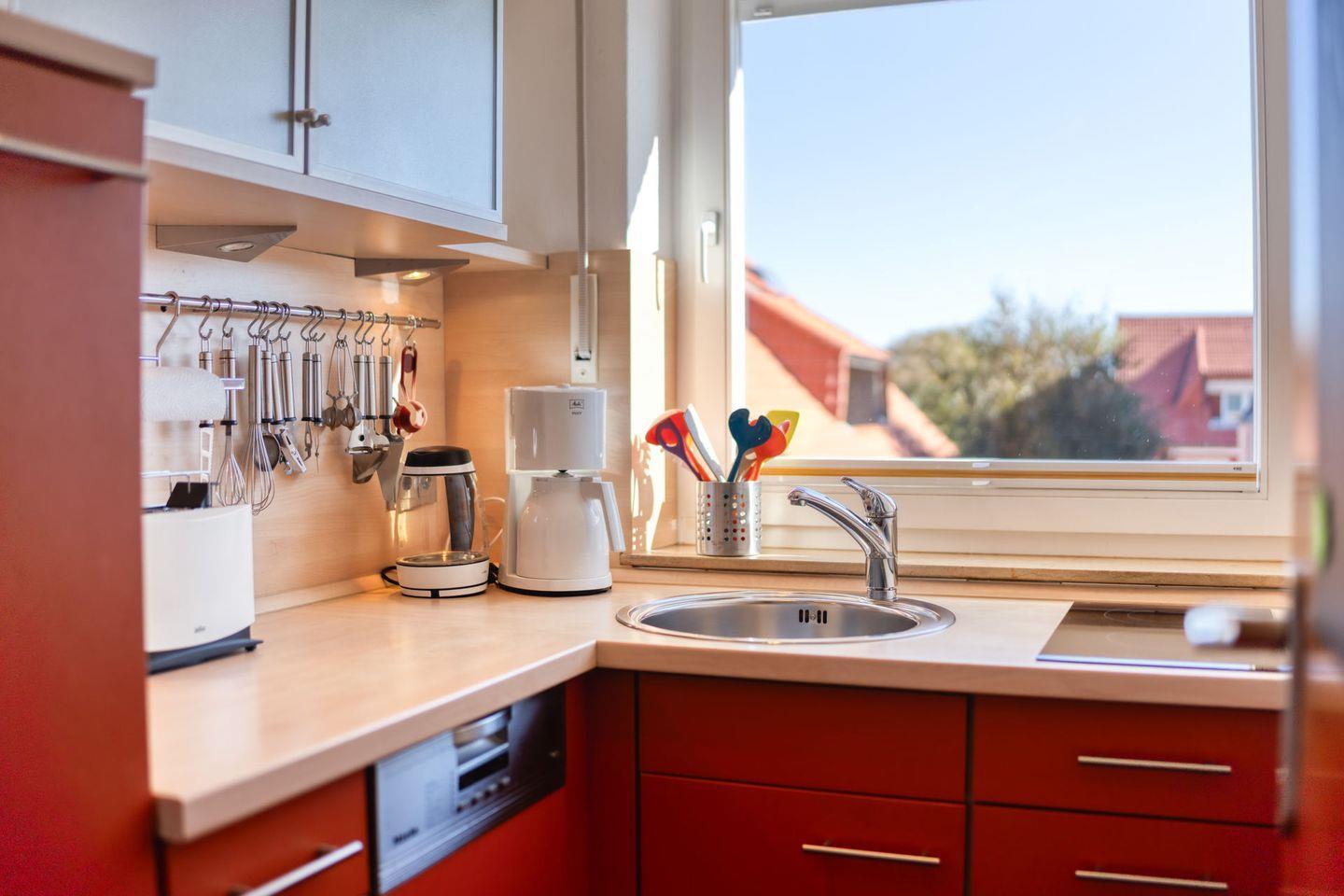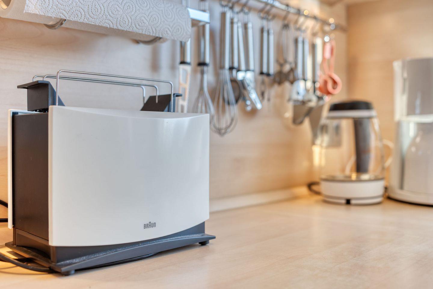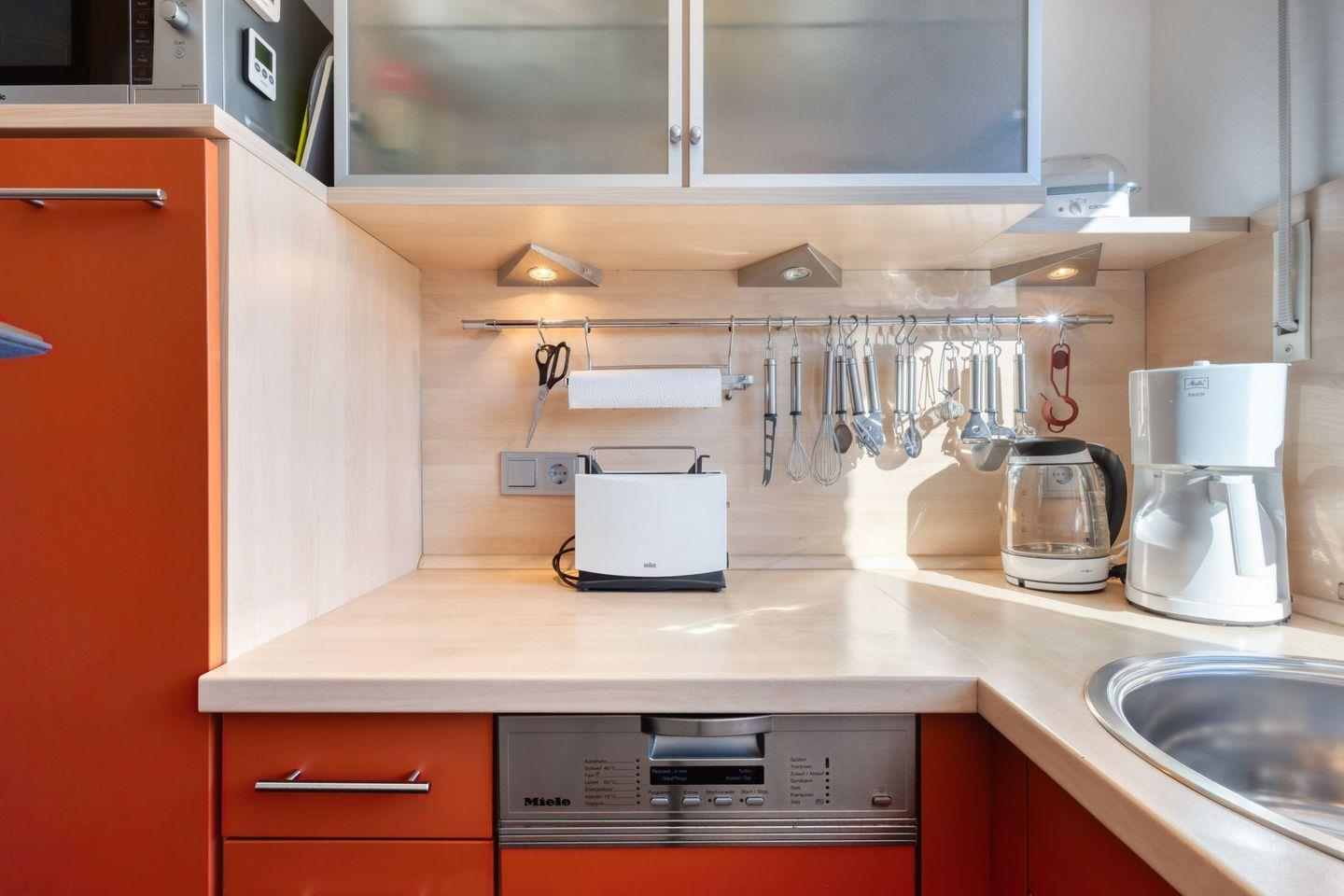 Im geschlossenen Küchenbereich erwartet Sie eine umfassende Ausstattung, die alle notwendigen Geräte für die Selbstversorgung bereithält: Cerankochfeld, Mikrowelle (mit Heißluft- und Grillfunktion), Geschirrspüler, Kühlschrank, Kaffeemaschine, Wasserkocher, Toaster sowie Eierkocher. Auch ausreichend Küchenutensilien, Geschirr und Besteck sind vorhanden. Für gemütliche Mahlzeiten steht Ihnen ein Essbereich mit Esstisch zur Verfügung.