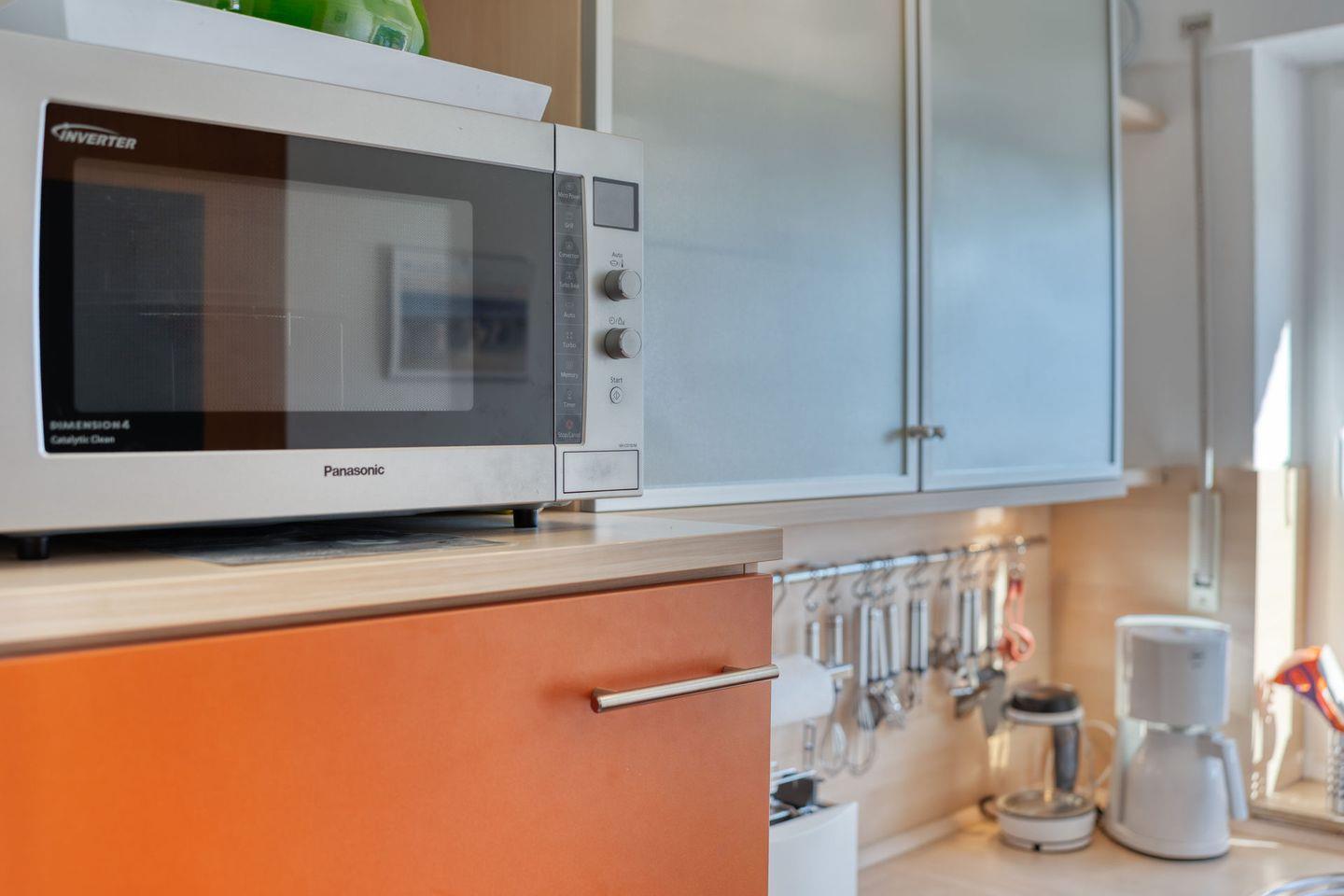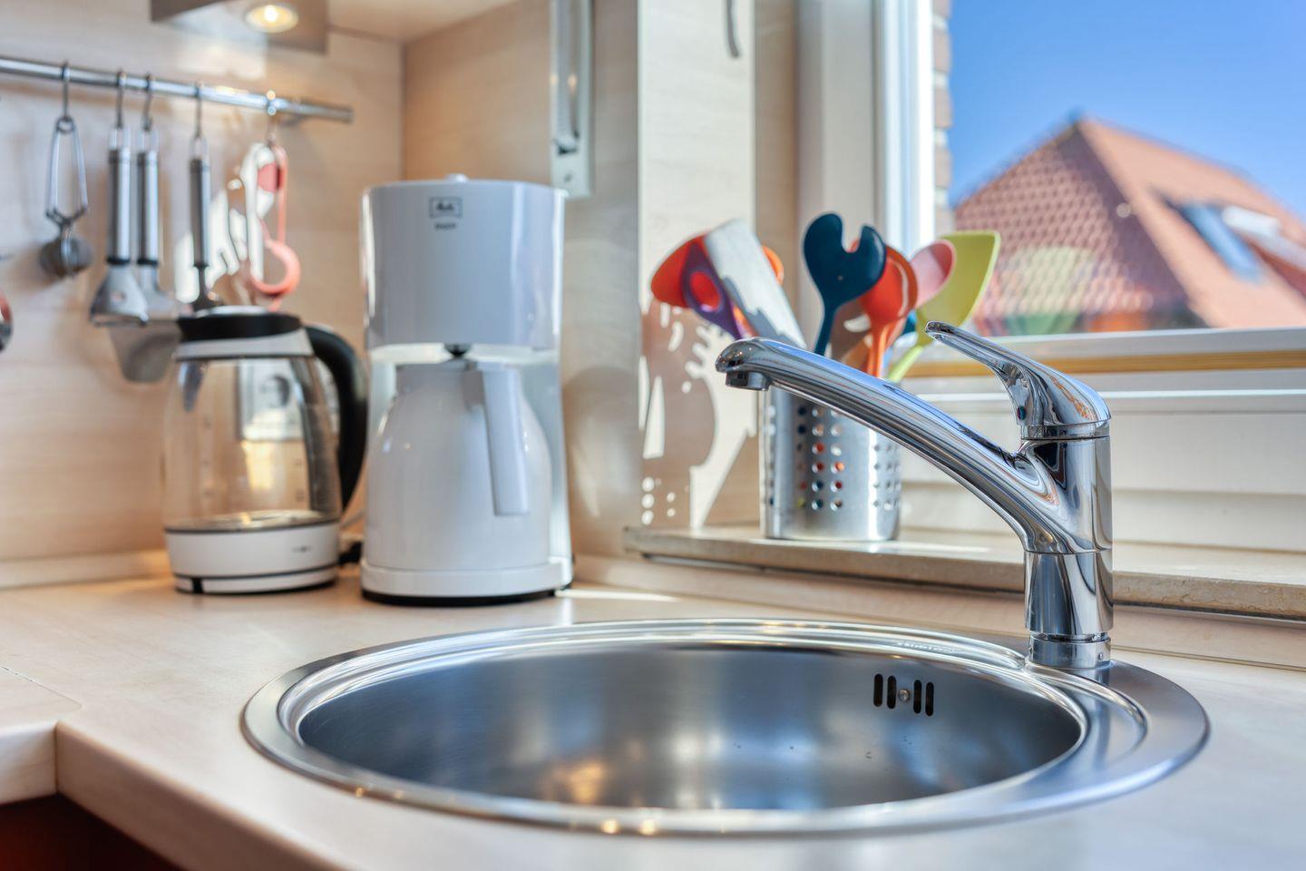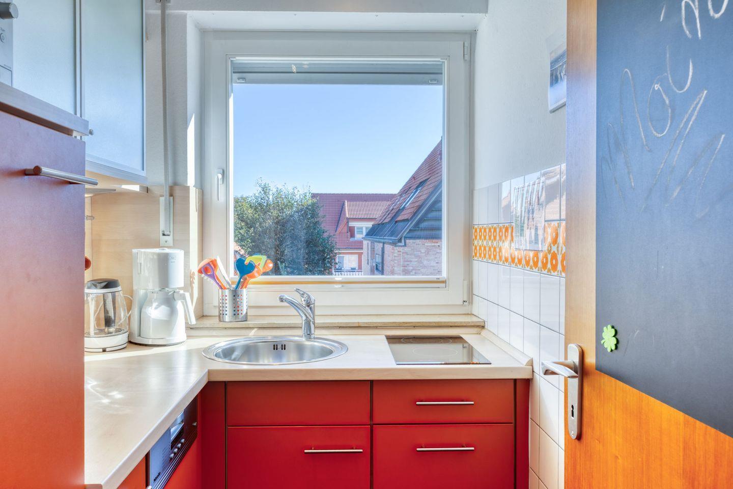 Im geschlossenen Küchenbereich erwartet Sie eine umfassende Ausstattung, die alle notwendigen Geräte für die Selbstversorgung bereithält: Cerankochfeld, Mikrowelle (mit Heißluft- und Grillfunktion), Geschirrspüler, Kühlschrank, Kaffeemaschine, Wasserkocher, Toaster sowie Eierkocher. Auch ausreichend Küchenutensilien, Geschirr und Besteck sind vorhanden. Für gemütliche Mahlzeiten steht Ihnen ein Essbereich mit Esstisch zur Verfügung.